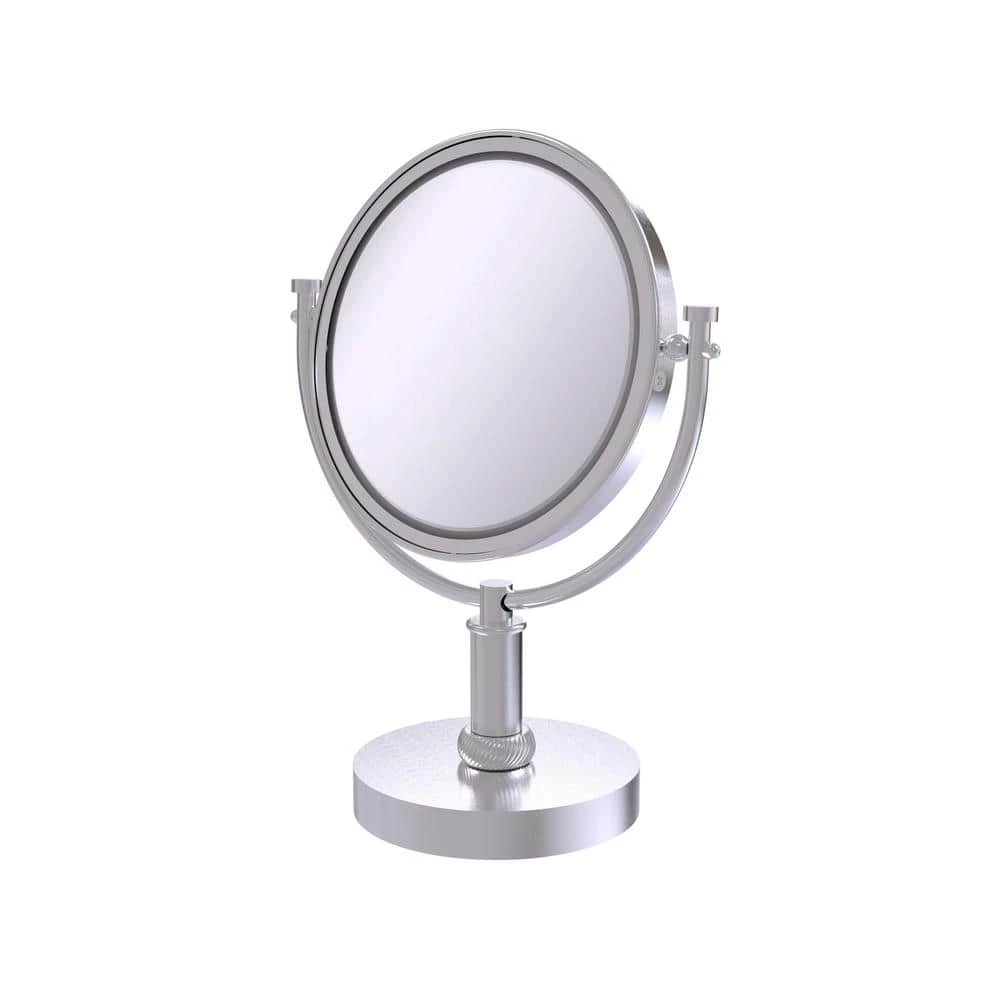 Add this stylish makeup mirror to your bathroom decor for an elegant touch. Makeup and shaving mirror pivots and tilts to allow for complete versatility in viewing angles. Overall Heigh of the mirror is 15 in. Mirror is made from the finest solid brass materials. 8 in. double faced mirror features clear magnification on 1-side.
