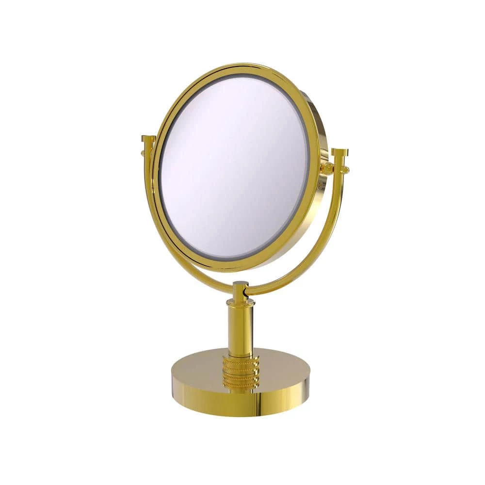 Add this stylish makeup mirror to your bathroom decor for an elegant touch. Makeup and shaving mirror pivots and tilts to allow for complete versatility in viewing angles. Overall Height of the mirror is 15 in. Mirror is made from the finest solid brass materials 8 in. double faced mirror features clear magnification on 1 side.