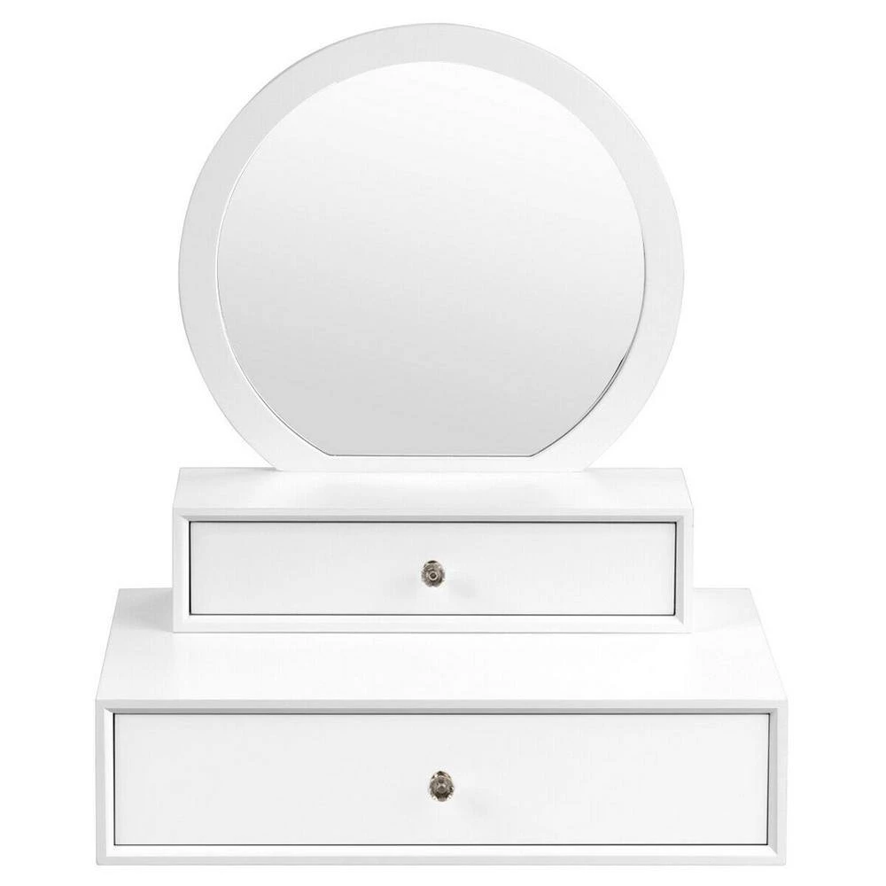 This wall mounted vanity mirror with 2 drawers without occupied floor space. And our vanity mirror is the ideal choice for the small room. More, chic and gorgeous design combines with versatile function, adds an incredible atmosphere to your room. Besides, this vanity mirror also can be laid smoothly on the table. The white style vanity mirror is easy to match your table. Additionally, all your makeup and cosmetics will be neatly organized with 2 drawers. The durable MDF board and well-craft construction ensure years worry-free use. More, it came mostly assembled, just need tens of minutes to put together the mirror part. It is the great gift for your girl. It’s worth buying!