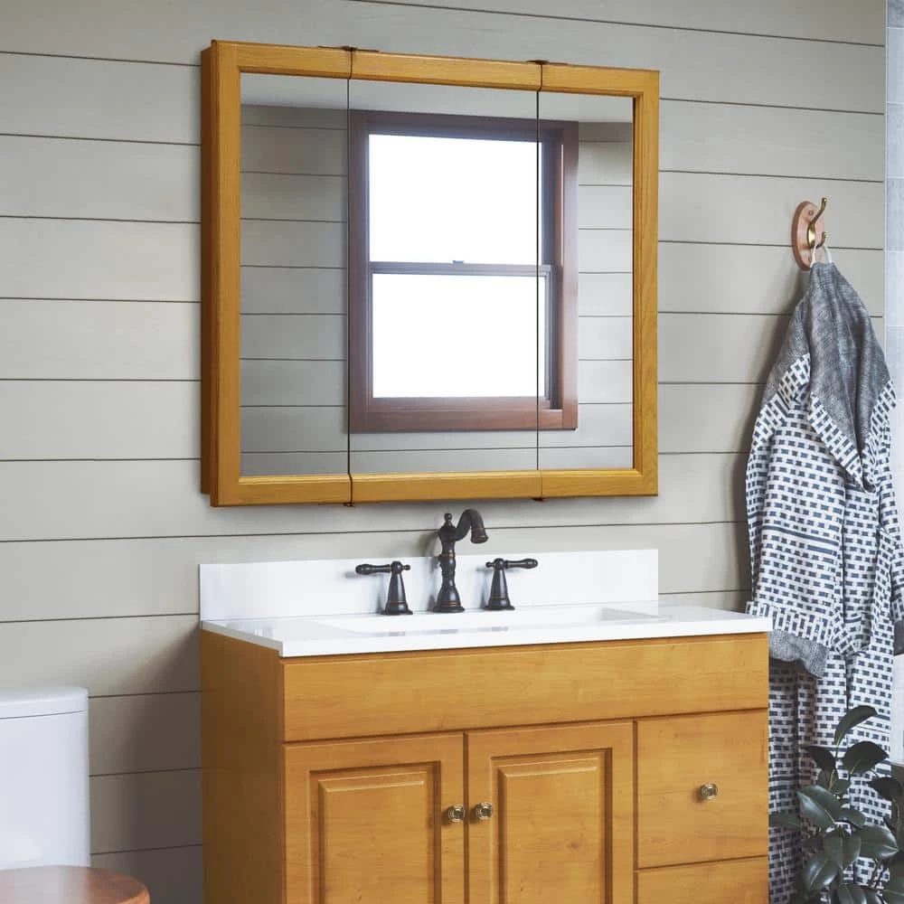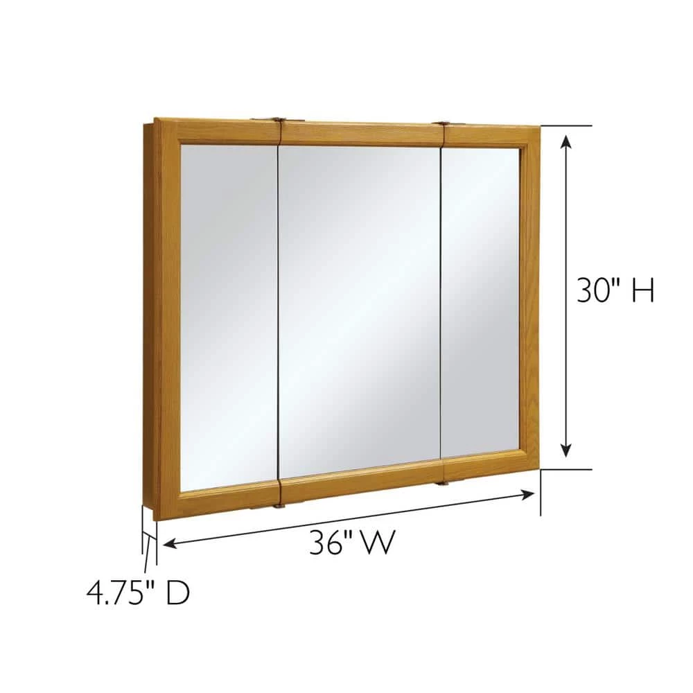 The Design House 545285-HOK Claremont honey oak tri-view medicine cabinet mirror features a honey oak finish with a water resistant seal. The cabinet-doors glide open revealing 2 stationary shelves to hold shampoo, medicine, makeup and other toiletries. This cabinet is built to withstand the moisture and humidity from your shower and will not chip or stain. Use this mirror for shaving or applying makeup in the morning. Product comes assembled and ready for installation.