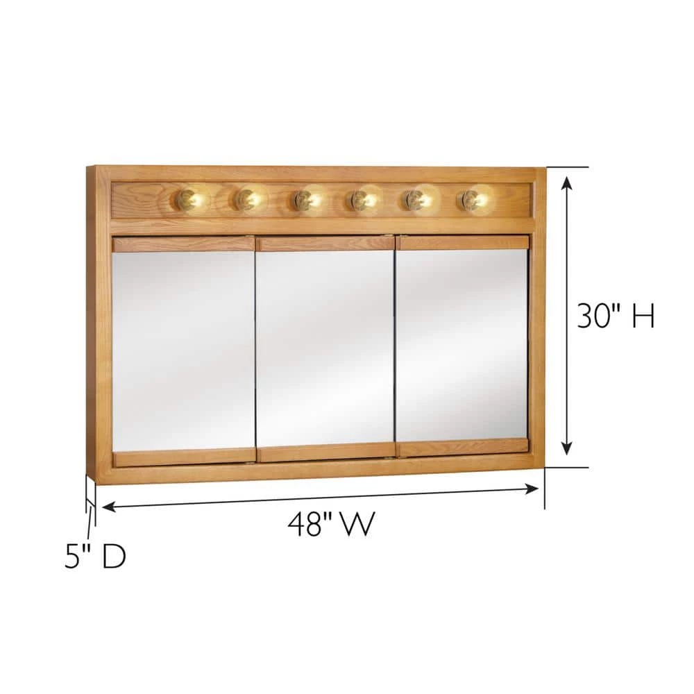 The Design House 530626-NOK Richland lighted tri-view medicine cabinet mirror features a water-resistant nutmeg oak finish, a solid wood frame, 3-door design and (6) vanity lights to brighten your entire space. Uses (6) 60-Watt medium base bulb or LED equivalent (not included). The cabinet-doors glide open revealing 2-stationary shelves to hold shampoo, medicine, makeup and other toiletries. This cabinet is built to withstand the moisture and humidity from your shower and will not chip or stain. Use this mirror for shaving or applying makeup in the morning. Product comes assembled and ready for installation.
