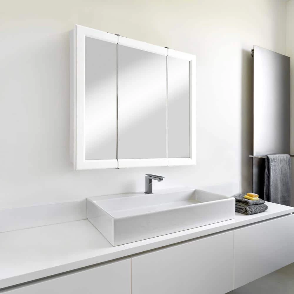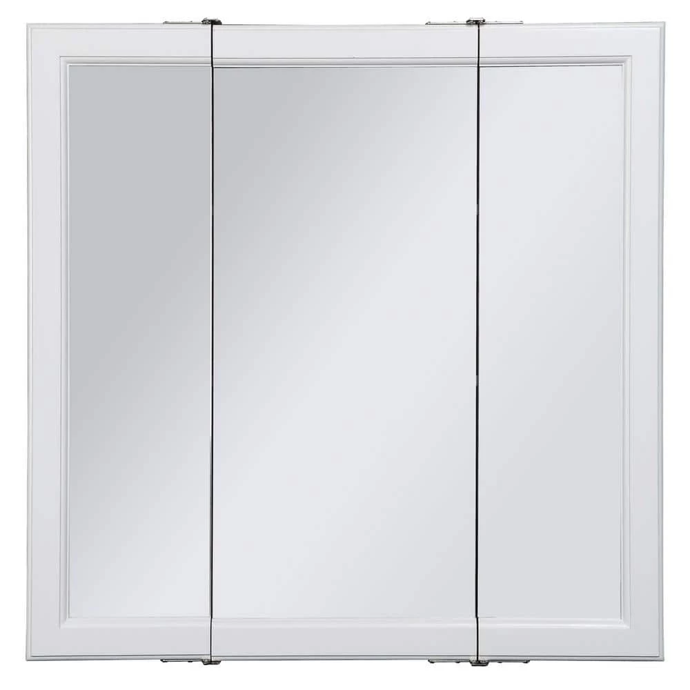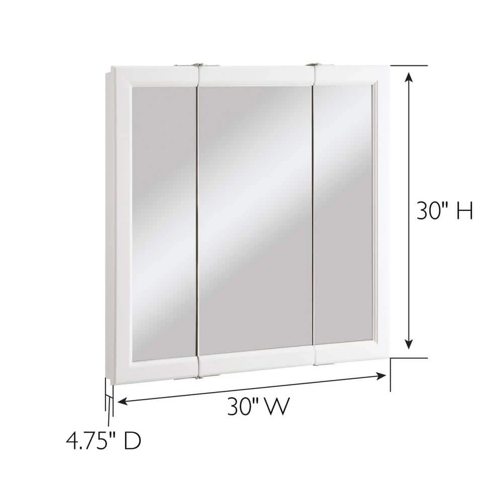 The Design House 545293-WHT Wyndham tri-view medicine cabinet features a classic white finish, 3 doors, a solid wood frame and 2 stationary shelves. It measures 30 in. W x 4.75 in. D x 30 in. H. The cabinet doors glide open revealing 2 sturdy shelves to hold shampoo, medicine, makeup and other toiletries. This cabinet is built to withstand the moisture and humidity from your shower and will not chip or stain. Use this mirror for shaving or applying makeup in the morning. Product comes assembled and ready for installation.