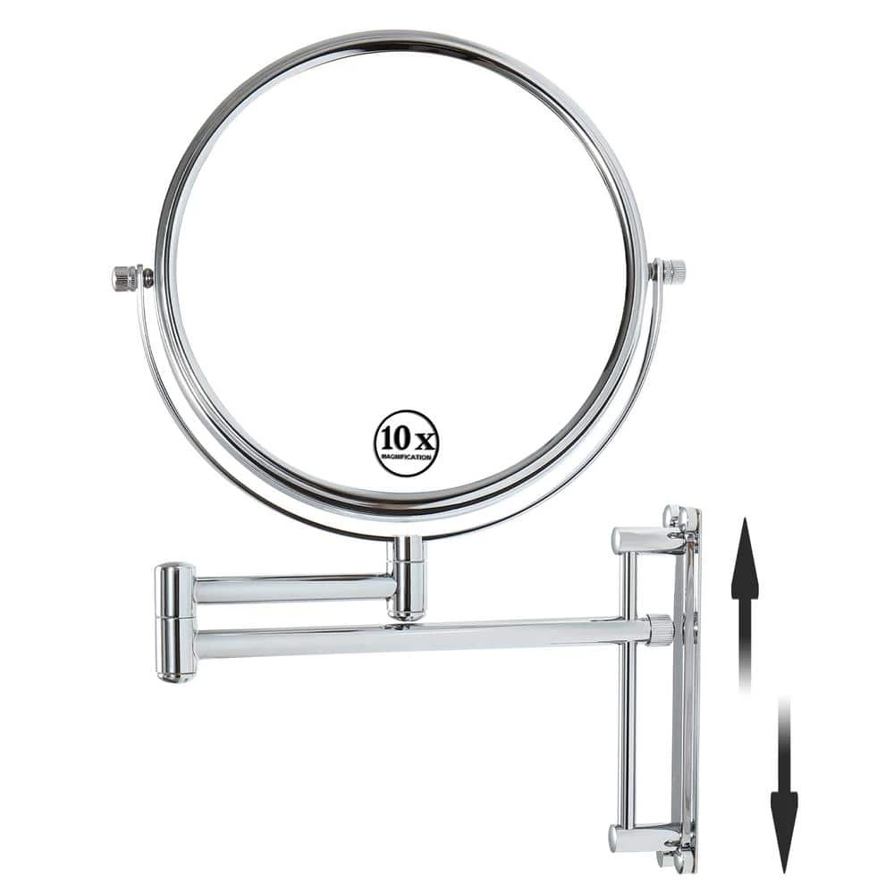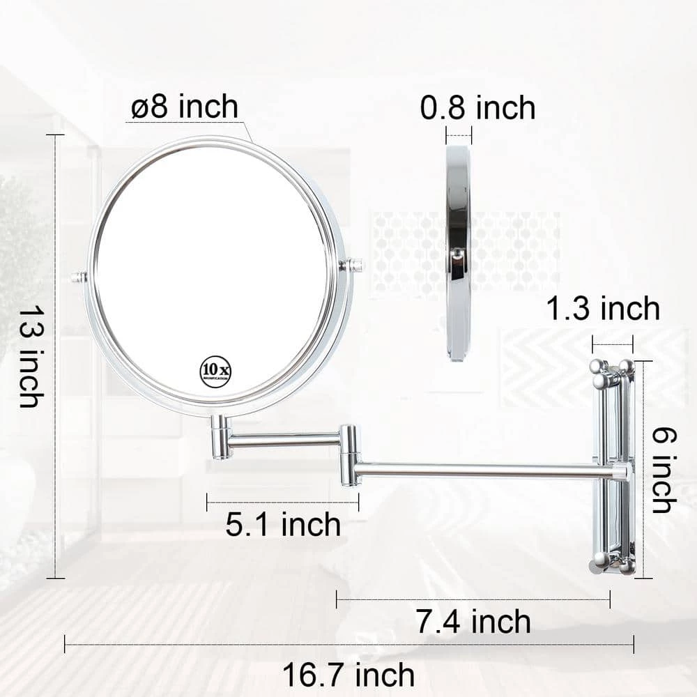 2-Sided Wall Mount Mirror is used in luxury hotels and spas because of its convenience, sleek look and magnification. This 2-sided mirror has an 8 in. Dia mirror frame and features a smooth 360° swivel design that provides 10x and 1x magnification options to make sure every detail of your hair and makeup are in place. The extension arm and smooth rotation adjusts to all angles for a dynamic point of view and extends up to 16.7 in. from the wall. This mirror can be easily adjusted, while still being firm enough to hold for odd angles. This mirror has an attractive finish that protects against moisture and condensation and is designed to be wall mounted. This item comes complete with mounting hardware and easy to install. The 2-Sided Wall Mount Mirror comes with a 1-year limited warranty that protects against any defects due to faulty material or workmanship.