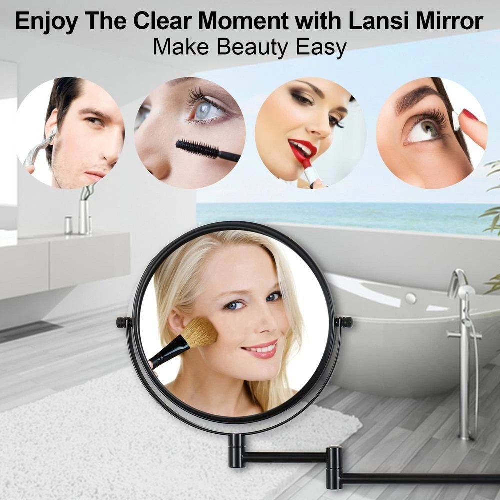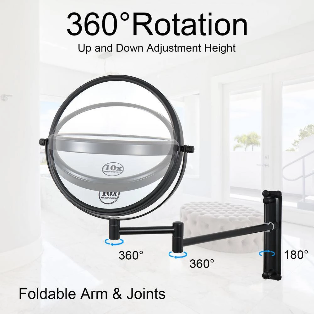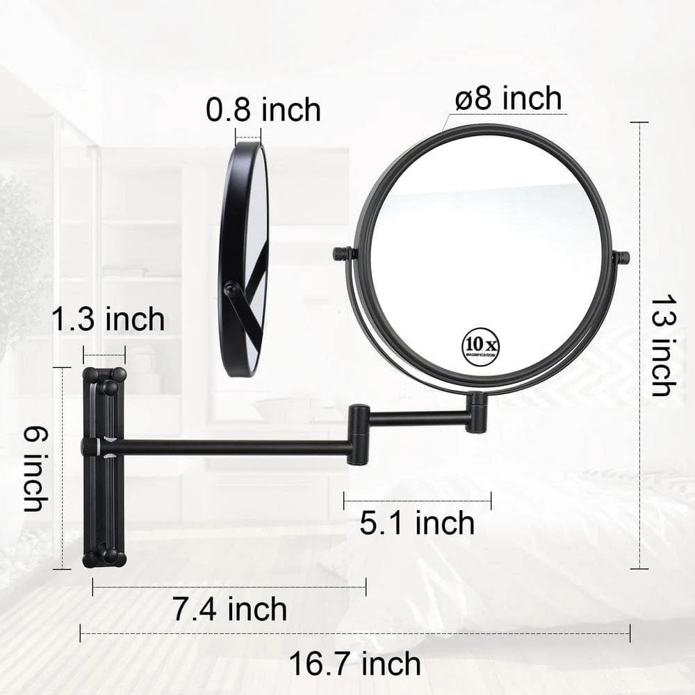 2-Sided Wall Mount Mirror is used in luxury hotels and spas because of its convenience, sleek look and magnification. This 2-sided mirror has an 8 in. Dia mirror frame and features a smooth 360 degree swivel design that provides 10X and 1X magnification options to make sure every detail of your hair and makeup are in place. The extension arm and smooth rotation adjusts to all angles for a dynamic point of view and extends up to 16.7 in. from the wall. This mirror can be easily adjusted, while still being firm enough to hold for odd angles. This mirror has an attractive finish that protects against moisture and condensation and is designed to be wall mounted. This item comes complete with mounting hardware and easy to install. The 2-Sided Wall Mount Mirror comes with a 1-year limited warranty that protects against any defects due to faulty material or workmanship.
