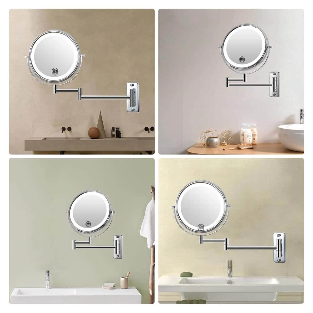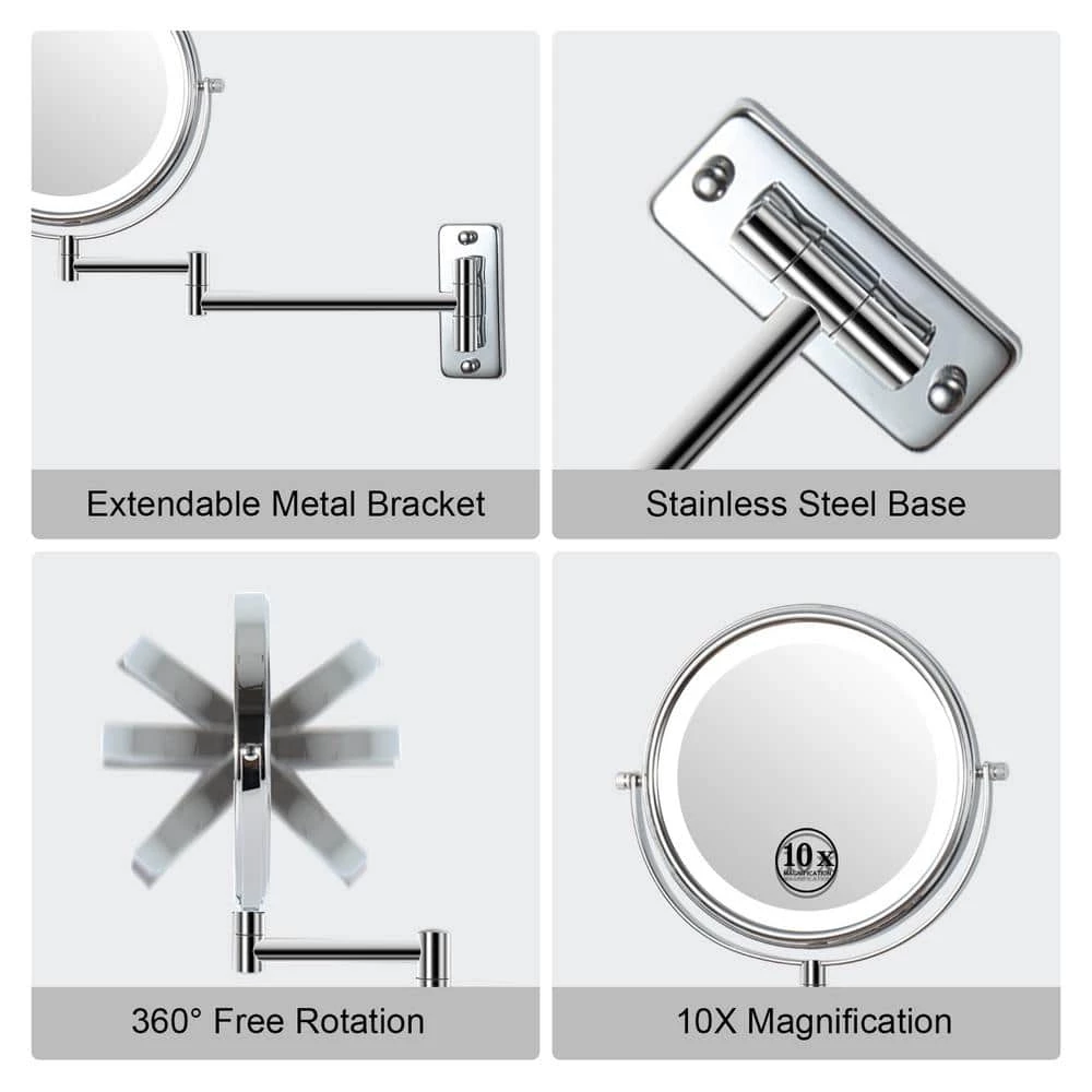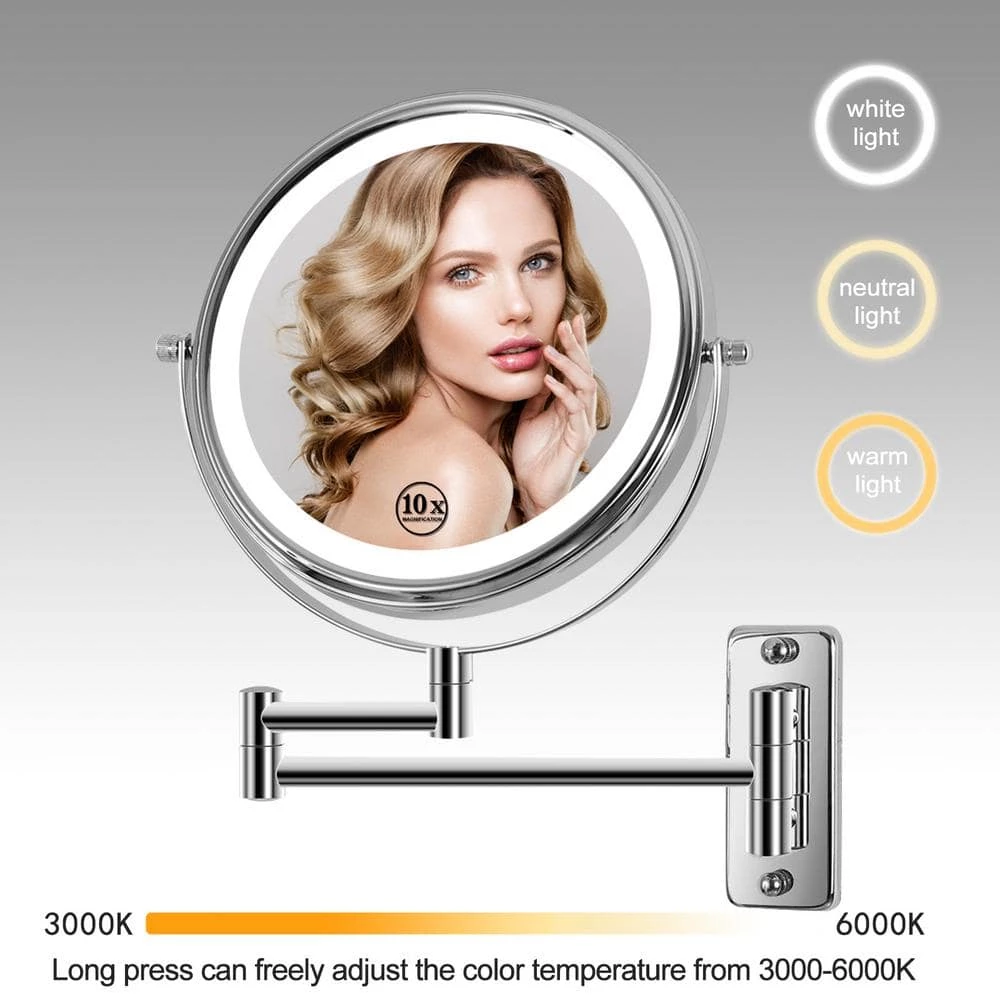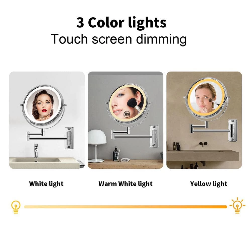 💡Wall Mounted Makeup Mirror with 3 Color Lights: This light mirror offers white light, warm light and cool light for makeup. This vanity mirror with adjustable touch-screen, short press to turn on and switch the Lighting models as Cool, Natural, or Warm. Long press to adjust the brightness. 💗360°Swivel Extendable Design: The lighted wall mount mirror with extendable arm allow you to fix your mirror to the optimal position for perfect viewing. Adjusting the arm to any angle you desire. You can fold the mirror on the wall to save space when you are not using it. 💗Dual Sided 1X/10X Magnifying Mirror: This makeup mirror with lights is 8 Inch large size and double sided with 1X/10X magnification. 1X side is used for overall makeup, and10x side shows details of your face.【Staying 4 inches apart will make you feel better when using the lighted 10x magnifying mirror.】 🔋Double Power Supply: This makeup mirror with lights powerd by 4*AAA battery (not included) or USB cable (including). This bathroom mirror itself cannot store power. It is recommended that you use 3AAA rechargeable NiMH batteries for power, which can save more than 80% of the cost of buying batteries 👍Easy To Install & Perfect Gift : The lighted makeup mirror easy to mount, no professionals needed. This lighted Mirrors are the perfect gift for friends, family or loved ones on birthdays, anniversaries, Christmas or Thanksgiving.