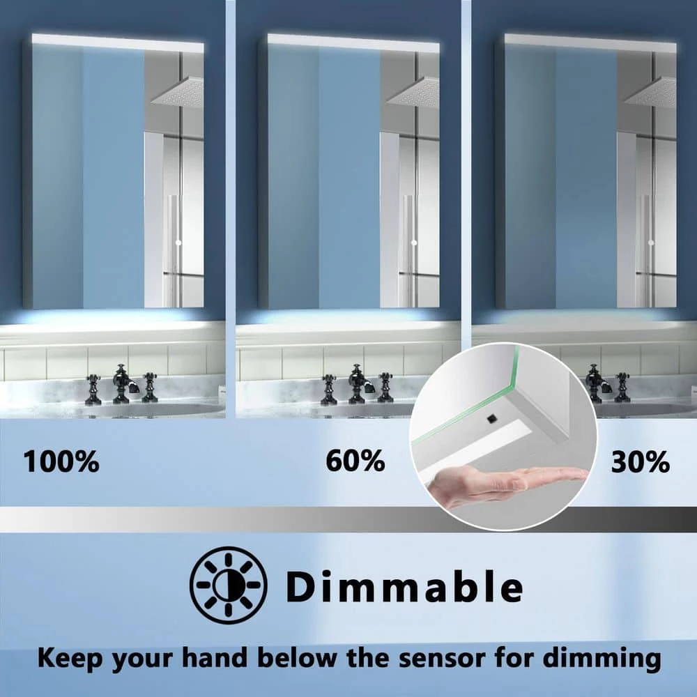 - Infrared sensor: inductive light switch at led medicine cabinet bottom, the palm moves in the sensible range to control the light on and off, the palm rests on the inductive light switch to adjust the brightness of the lighted medicine cabinet