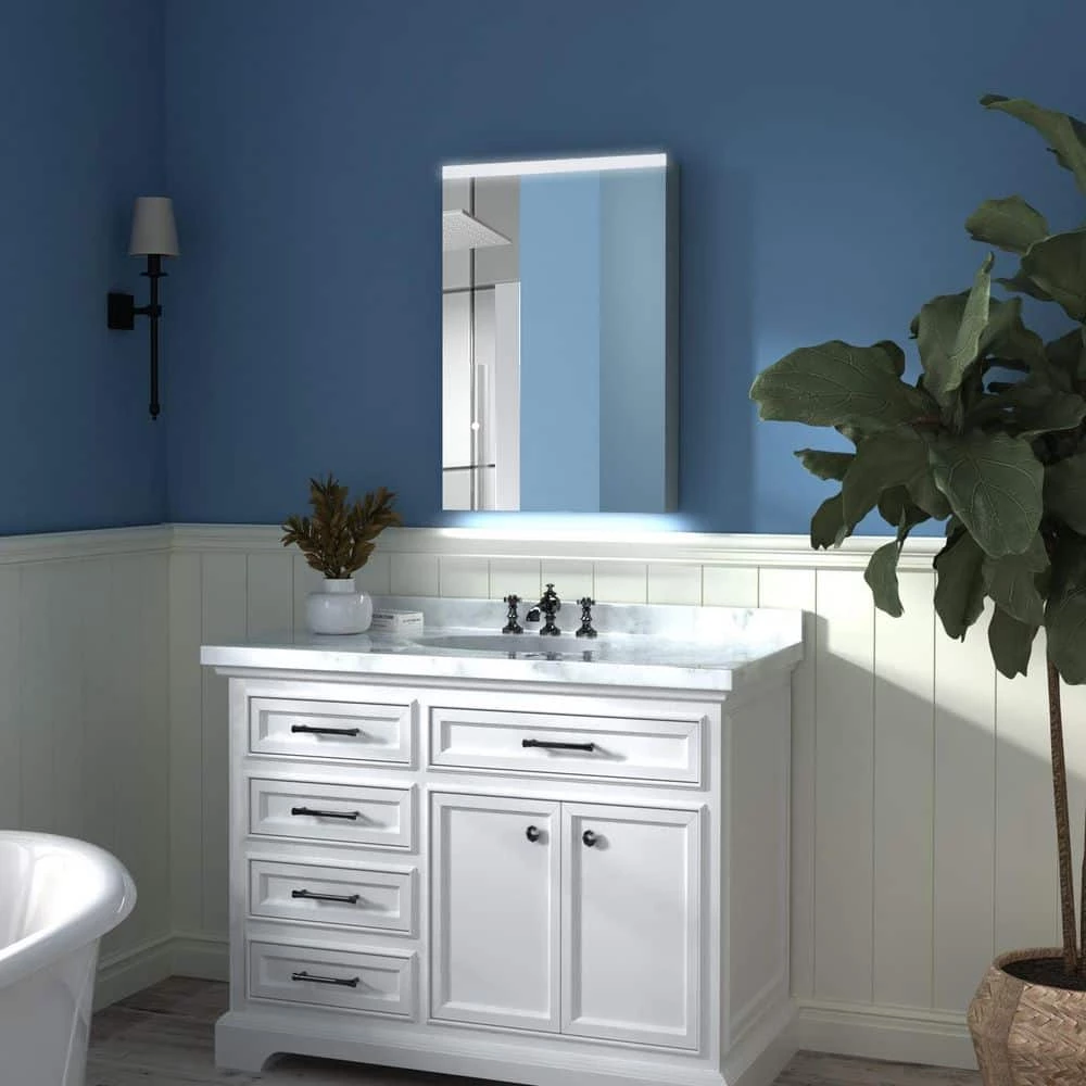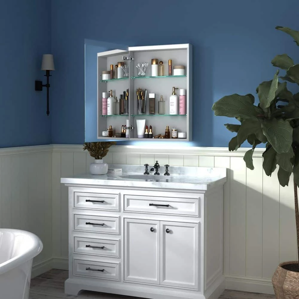 The Exbrite collection now offers mirrors with smart lights and medicine cabinets. Bathroom medicine cabinet with mirror provide uniform and optimal bright lighting, which can eliminate harsh shadows and hot spots when you are tidying up, plucking, shaving, brushing your teeth or putting on makeup. The dimming function allows you to better control the lighting and room atmosphere, making daily grooming more enjoyable than ever. Exbrite lighted mirror and medicine cabinet can adjust the shelves at will, bid farewell to the messy bathroom, and become the queen’s private space. The rust-free aluminum bathroom vanity mirror with lights is durable and moisture-proof and is the best choice for your bathroom.