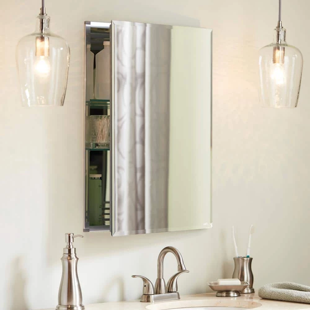 The classic fully functional Aluminum framed Medicine Cabinet. Beveled outer door mirror for that “decorator”” look. Two mirrors inside with adjustable glass shelves. This cabinet if fully functional closed or open.