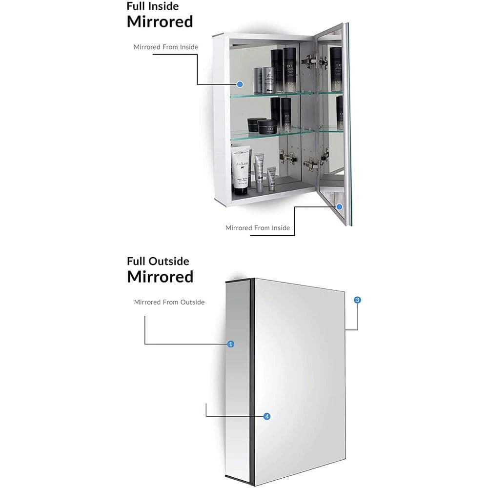 - Mirror on the wall- mirrored front door, back door, and mirrored rear wall will add beauty and elegance to any bathroom or vanity decor, mirrored sides provide superior visibility, frameless pencil edge, grooved all around for clean and easy access, soft closing hinges at 95° opening angle