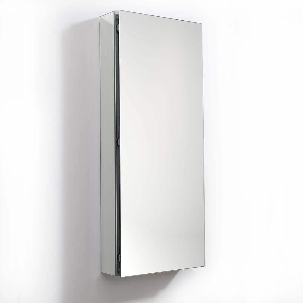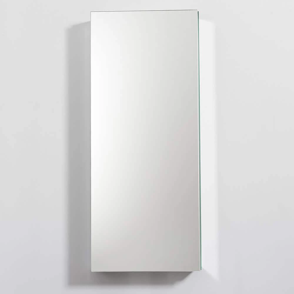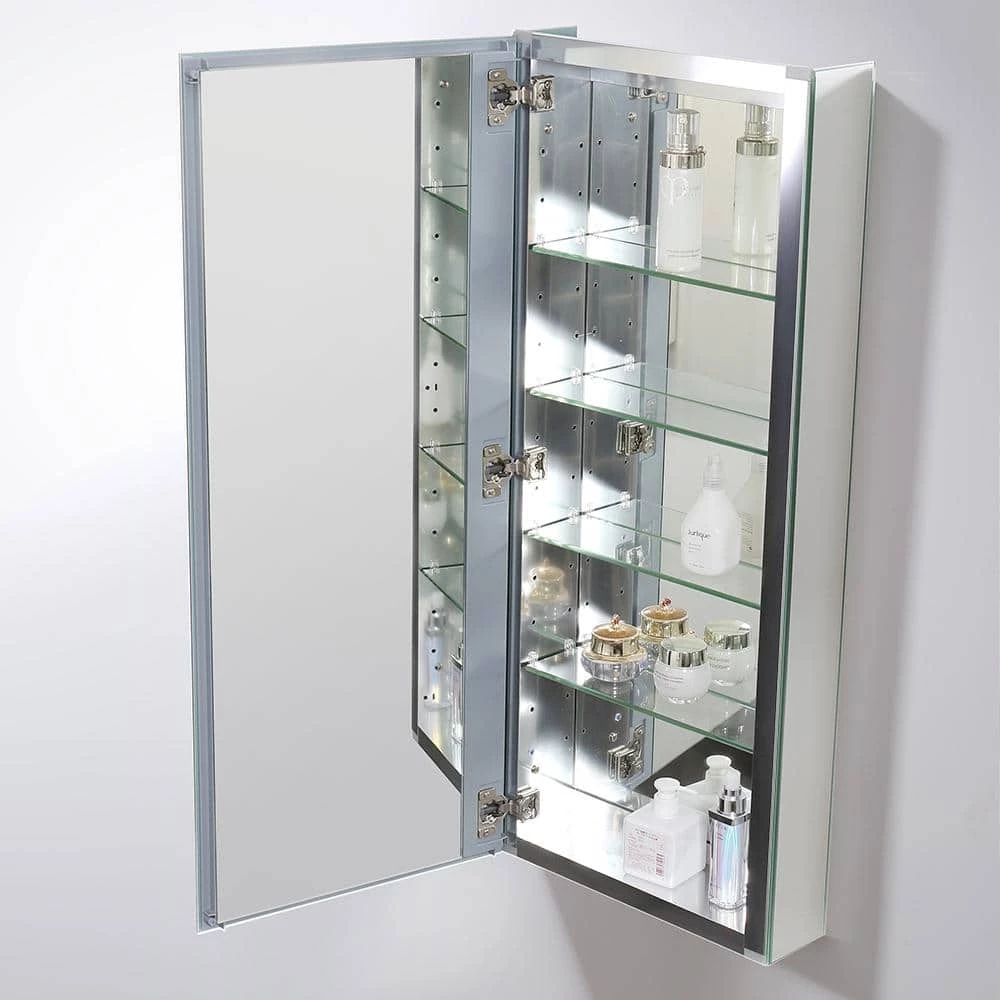 This stylish rectangular bathroom medicine cabinet has a contemporary frameless design. The mirrored door opens to reveal a second mirror at the back of the cabinet and four adjustable glass shelves that can accommodate items of varying heights. An anodized aluminum frame creates a moisture and dust resistant interior.