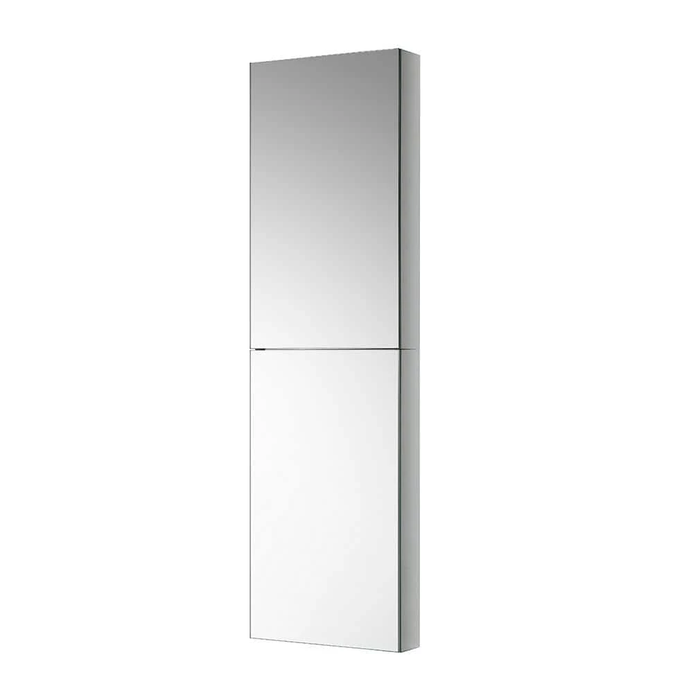 Every in. of this tall Fresca 15 Wide Bathroom Medicine Cabinet is mirrored inside and out to reflect light and give your bathroom a fresh and modern feel. Two doors feature mirrors on both sides, allowing you to keep an eye on your appearance while accessing daily necessities from within the cabinet. The interior back wall of the cabinet is also mirrored and has four adjustable tempered glass shelves that can accommodate items of varying heights. An anodized aluminum frame creates a moisture and dust resistant interior.