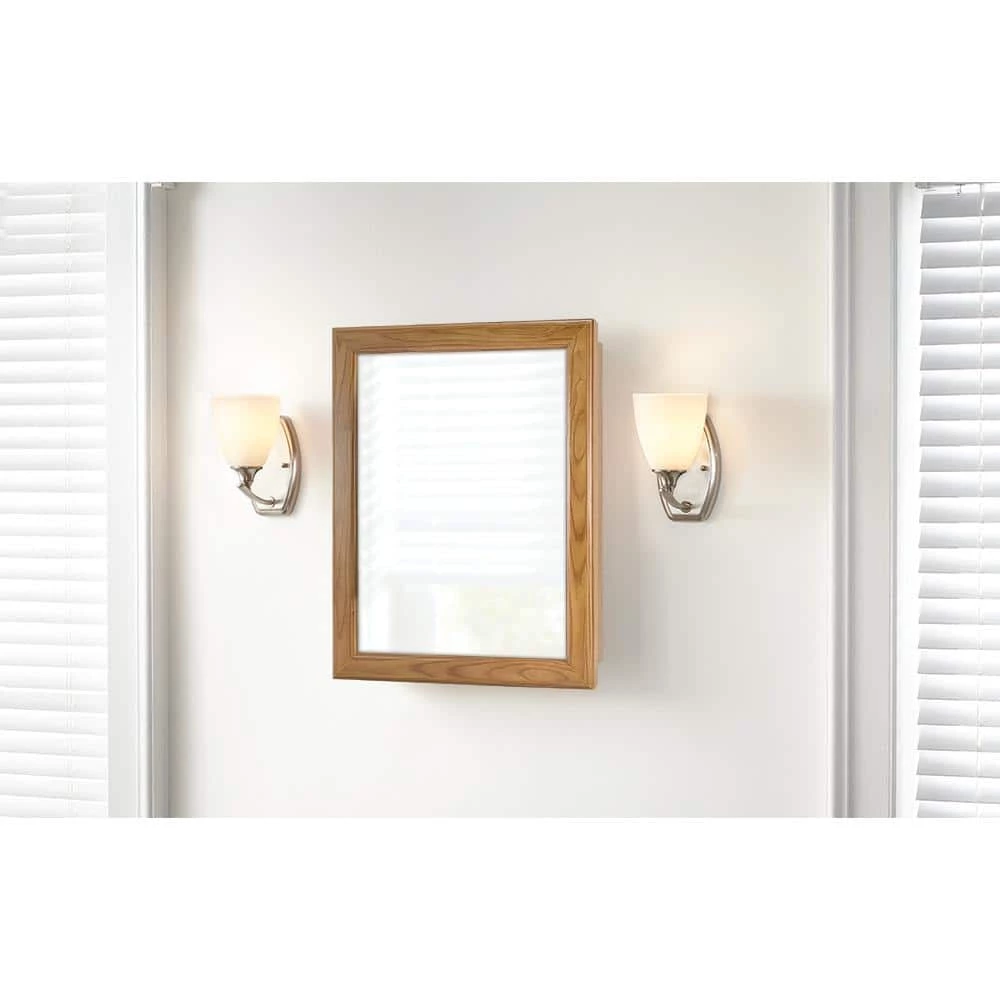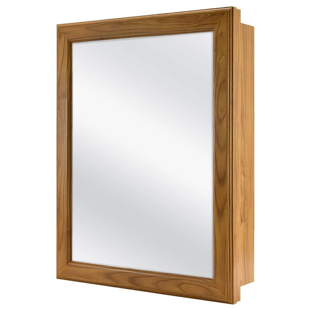 Add a classic look to your bathroom or powder room with this oak finished 15 1/8 in. W x 19 1/4 in. H x 4.58 in. D Glacier Bay Framed Recessed or Surface-Mount Bathroom Medicine Cabinet. The adjustable shelf offers ample storage flexibility. Double shelf pegs enable you to customize your space quick and easy. The versatility of this cabinet also allows the door to be reversible to open left or right based on your preference. Wood Composite construction provides exceptional durability and strength. Fully assembled for your convenience.