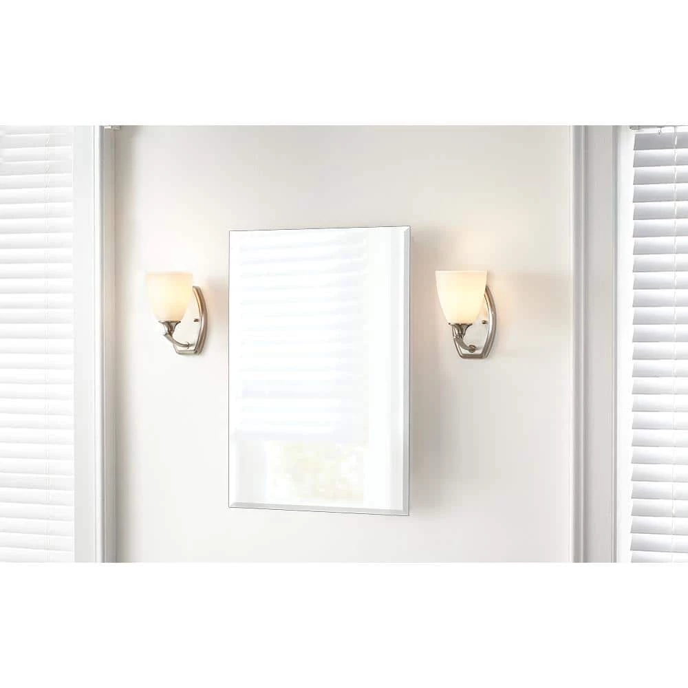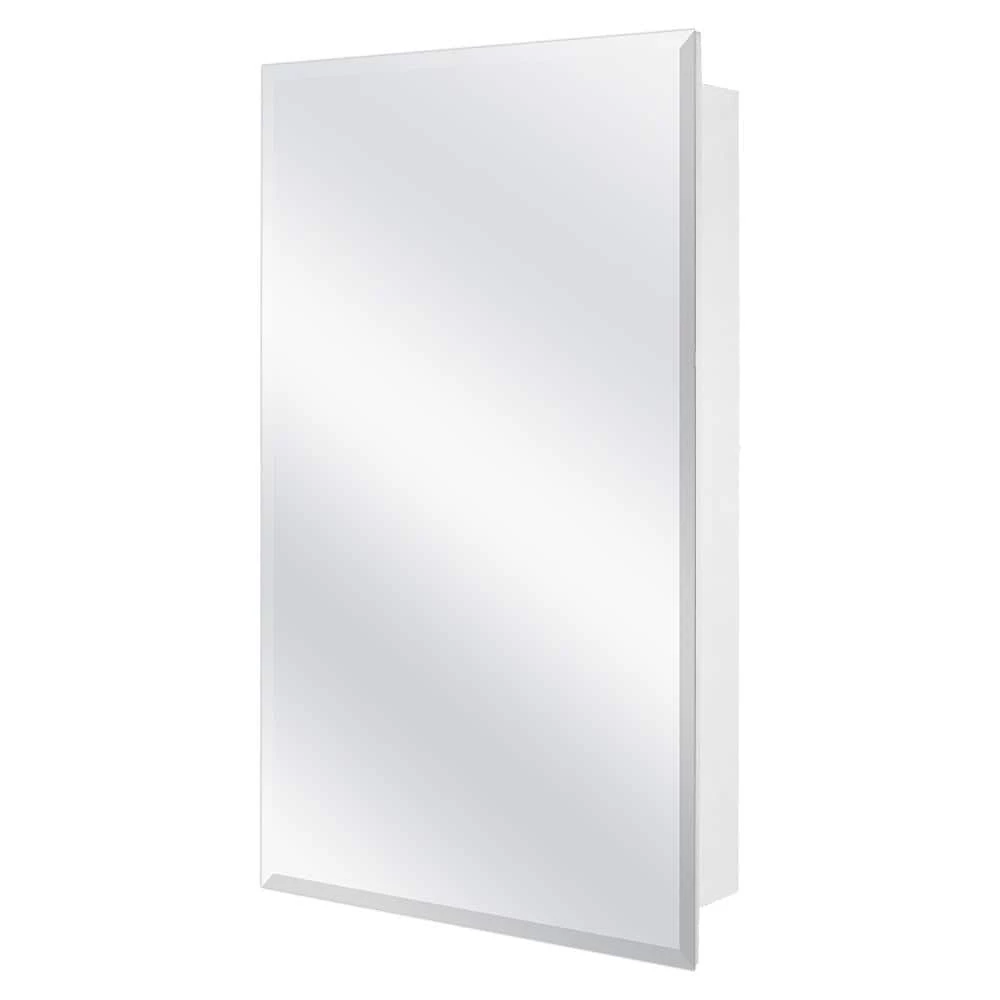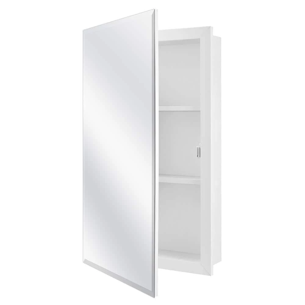 A perfect complement to any bathroom style, the Glacier Bay 16 in. W x 26 in. H x 4-1/2 in. D Frameless Recessed or Surface-Mount Bathroom Medicine Cabinet features beveled edges and a classic frameless design. Cabinet is white finish. The 2-adjustable shelves offers ample storage flexibility. Double shelf pegs enable you to customize your space quick and easy. The versatility of this cabinet also allows the door to be reversible to open left or right based on your preference. Wood Composite construction provides exceptional durability and strength. Fully assembled for your convenience.