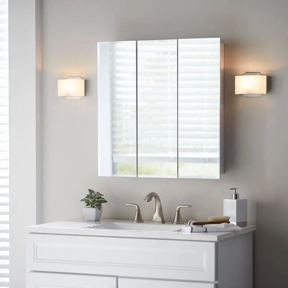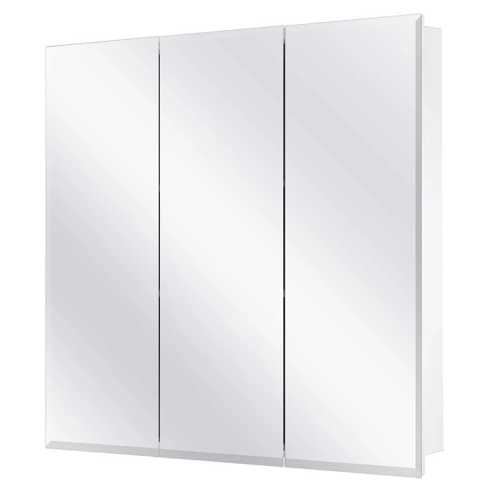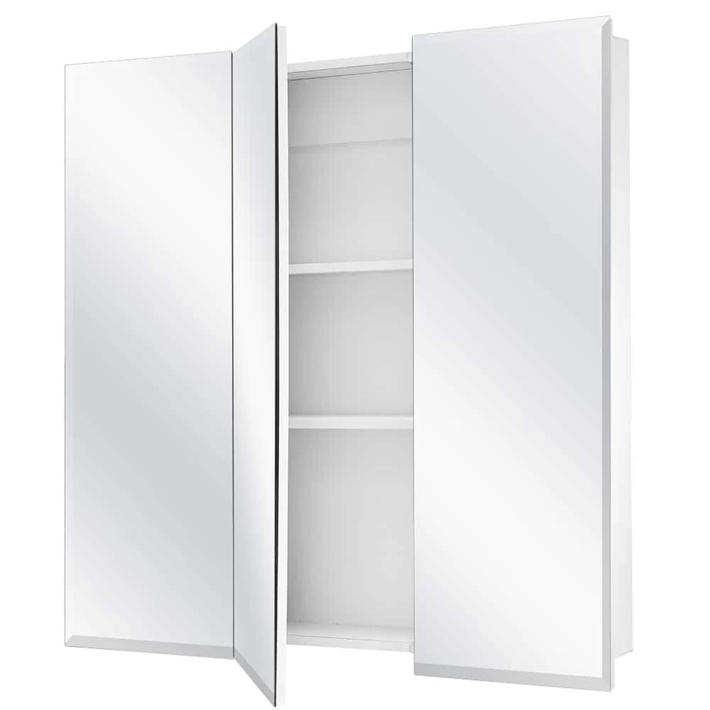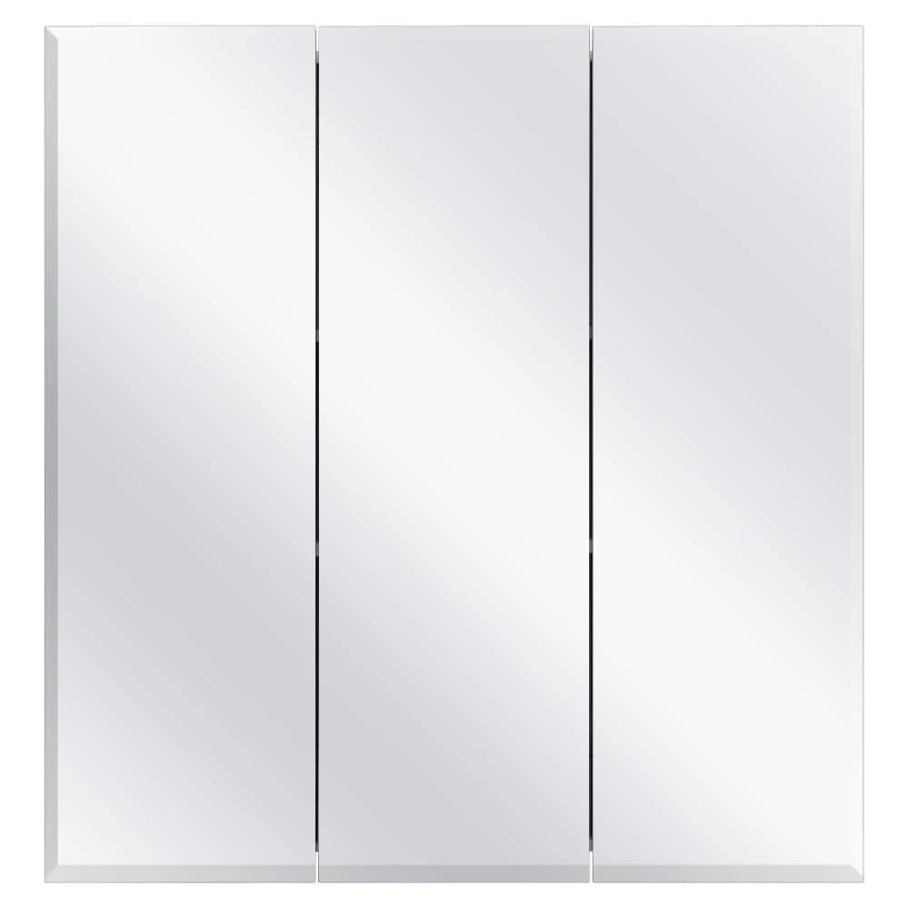 A perfect complement to any bathroom style, the Glacier Bay 24-3/8 in. W x 25-1/4 in. H x 4.37 in. D Frameless Surface-Mount Tri-View Bathroom Medicine Cabinet features beveled edges and a classic frameless design. Cabinet is white finish. The tri-view mirror offers multiple viewing angles for added functionality. The 2 adjustable shelves offers ample storage flexibility. Double shelf pegs enable you to customize your space quick and easy. Wood Composite construction provides exceptional durability and strength. Fully assembled for your convenience.