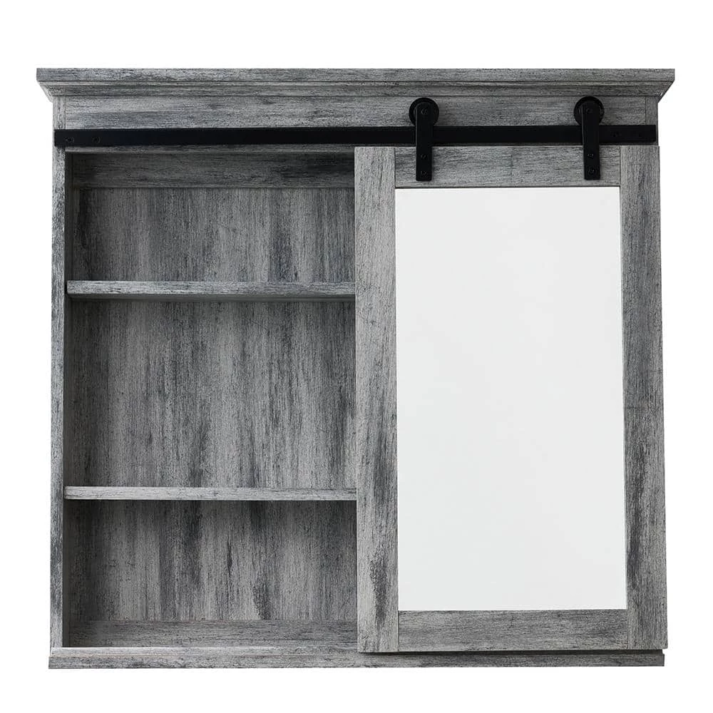 The Glacier Bay 29 in. x 31 in. Medicine Cabinet has an all wood case with a stylish Washed Gray finish. As functional as it is stylish, this trendy barn door cabinet has 2 adjustable wooden shelves for plenty of storage and a mirror on the sliding door. Easy to install with a hanging kit included, this cabinet is surface mounted and will provide years of use and enjoyment.