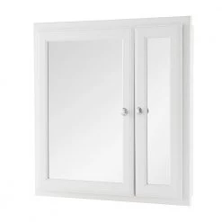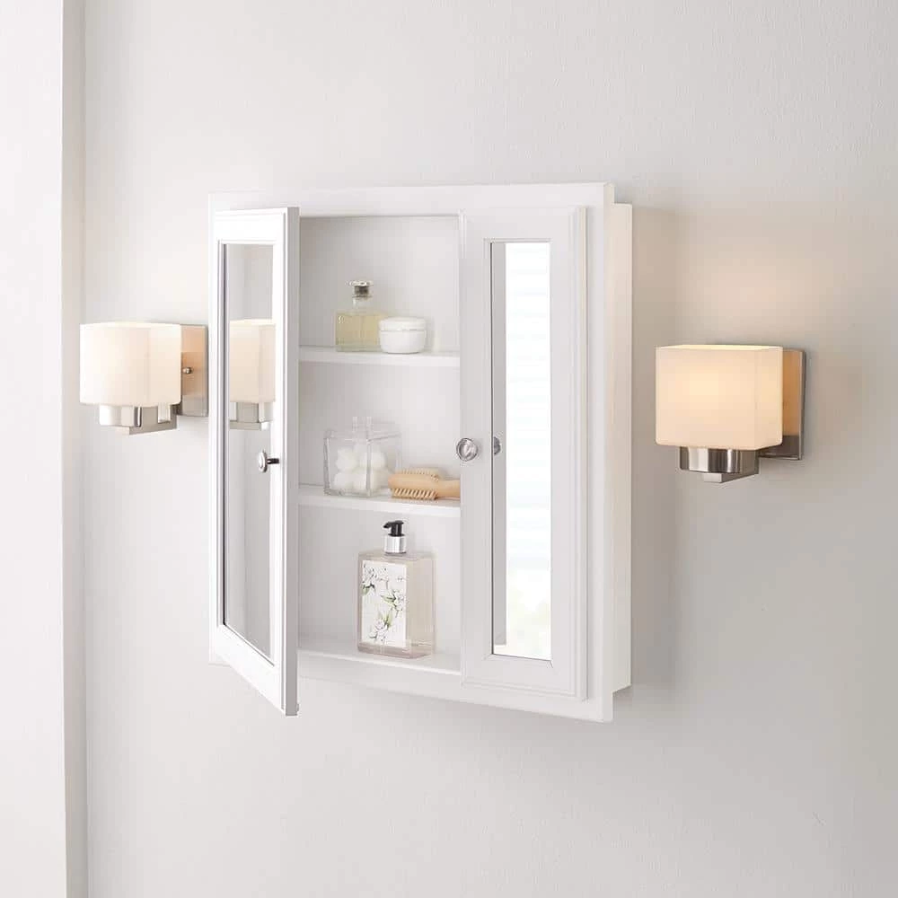 A perfect complement to any bathroom style, the Home Decorators Collections 24-1/2 in. W x 25-3/4 in. H x 5.35 in. D Fog Free Framed Surface-Mount Bi-View Bathroom Medicine Cabinet features a classic white finish. Our innovative, fog-free technology is safe, affordable and does not require heating elements. Enjoy a fogless reflection without wiping off your mirror or having to use a hairdryer to remove steam. The 2 adjustable shelves offers ample storage flexibility. Double shelf pegs enable you to customize your space quick and easy. Wood Composite construction provides exceptional durability and strength. Fully assembled for your convenience.