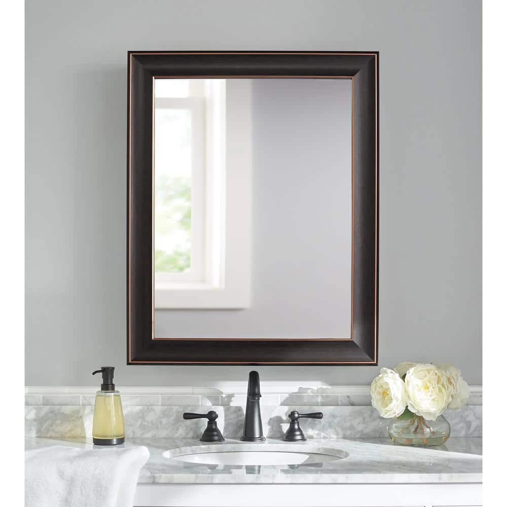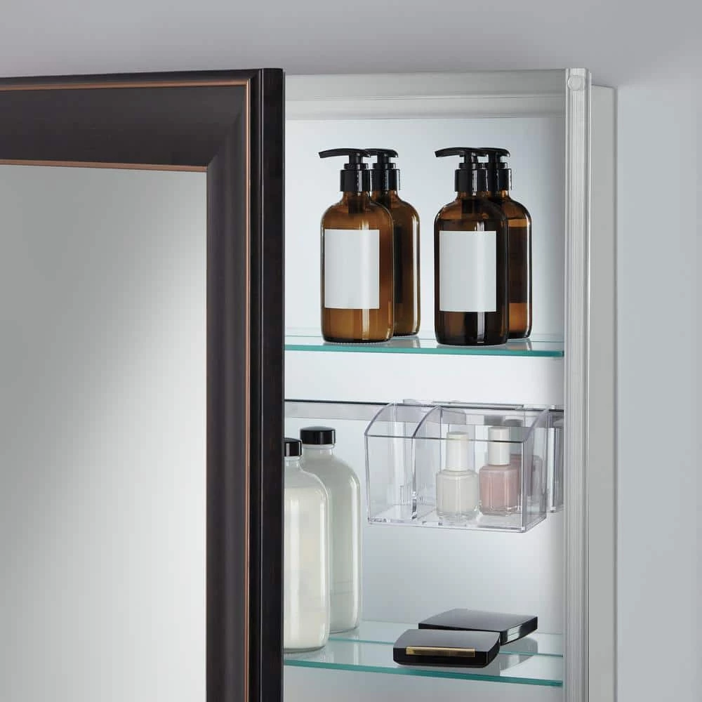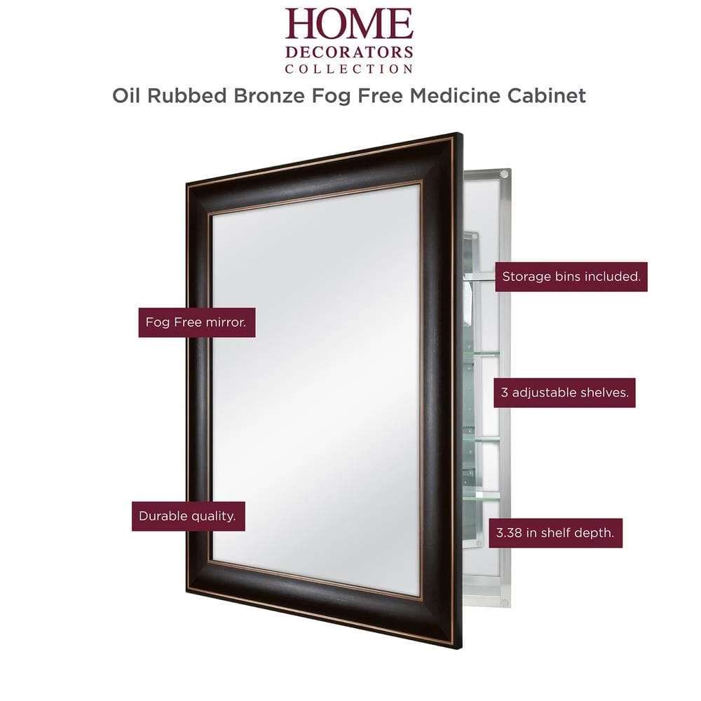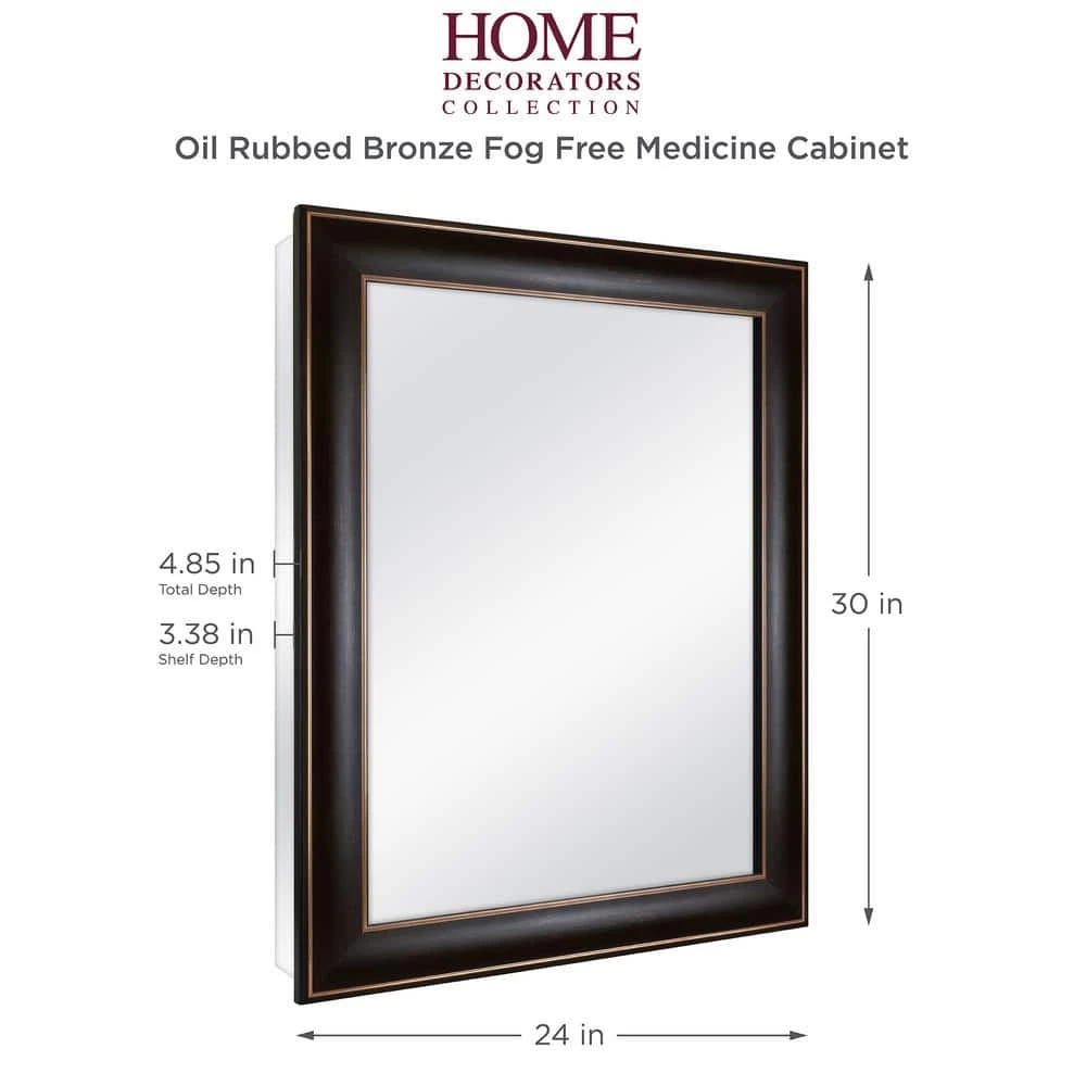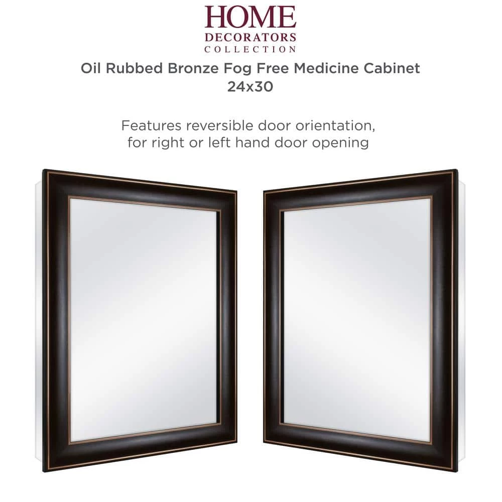 The Home Decorators Collection 24 in. W x 30 in. H x 4.85 in. D Fog Free Framed Oil Rubbed Bronze Recessed or Surface-Mount Medicine Cabinet gives you a fogless reflection you’ve always dreamed of. Our innovative, fog-free technology is safe, affordable and does not require heating elements. Enjoy a fogless reflection without wiping off your mirror or having to use a hairdryer to remove steam. Includes side mirrors and hardware for optional surface mount feature. The 3 adjustable glass shelves are easy and quick to customize with the double shelf pegs included. Also included are 3 removable bins for even more storage that are dishwasher safe. The door opens 165° allow for optimal usage of the interior door and back mirror for multiple viewing angles for added functionality. The durable rust-free aluminum frame is exceptionally strong and the mirror is already assembled for your convenience. The EZ-cam hanging system allows you to securely install your medicine cabinet with the included hardware and hanging instructions. The versatility of this cabinet also allows the door to be reversible to open left or right based on your preference. The oil rubbed bronze finish can easily coordinate with any existing bathroom hardware.