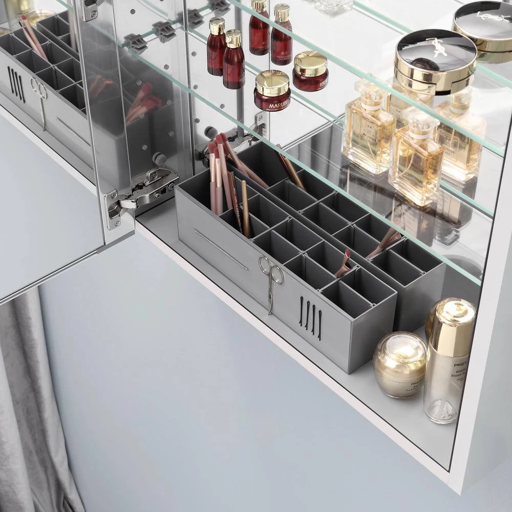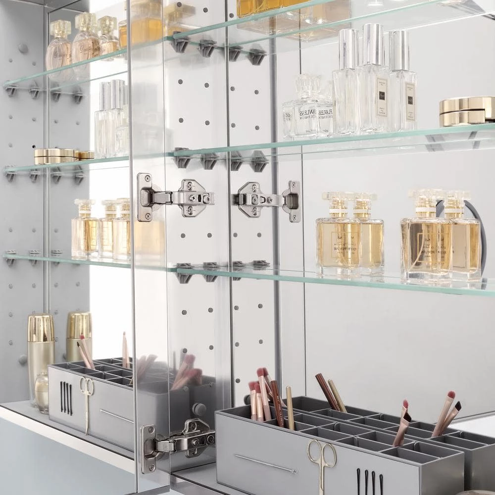 The traditional appearance of the Frankford medicine cabinet is deceiving. This beautiful aluminum framed unit features a bountiful amount of storage behind its classic framing. All the shelving is adjustable, making it ideal for all your different products and supplies.