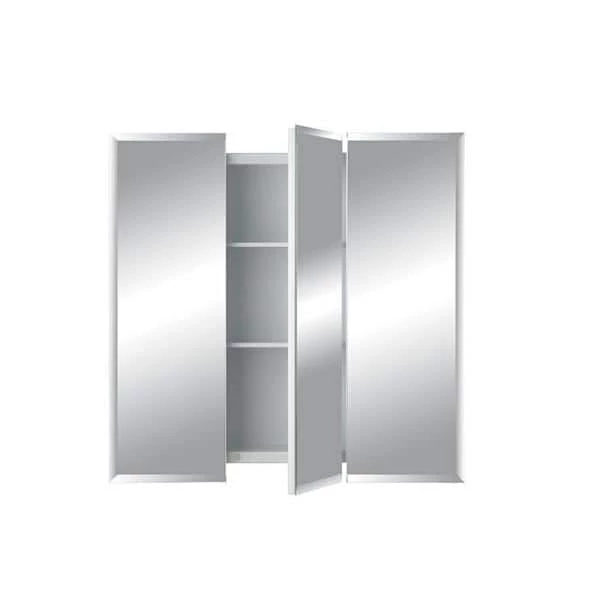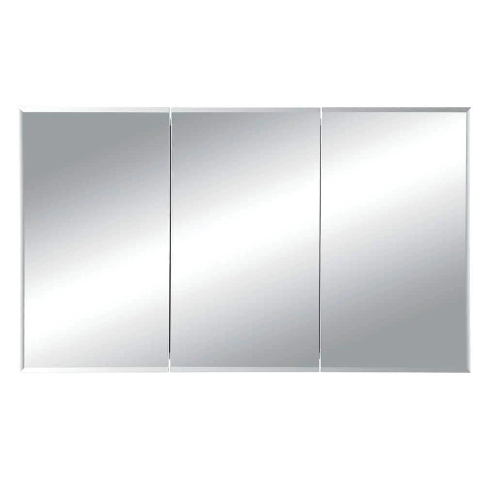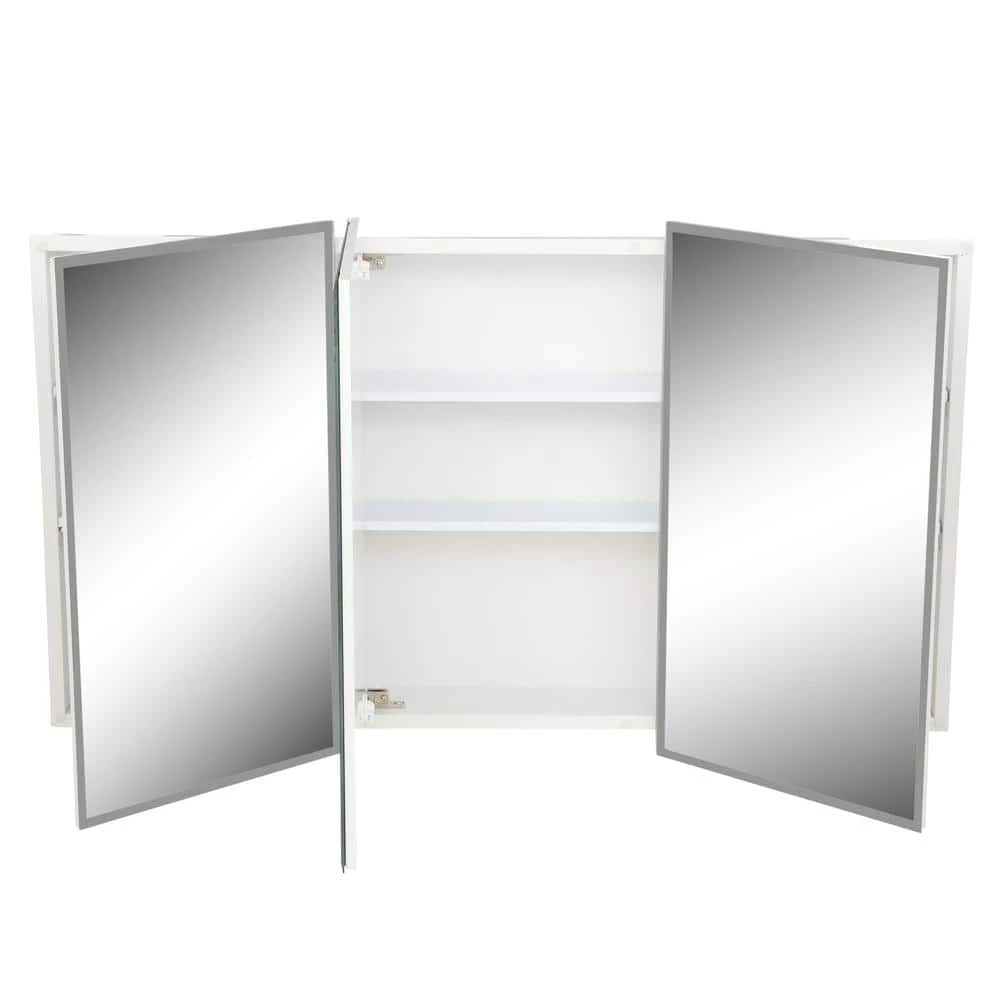 The Jensen Horizon 3 Door 48 in. W Recessed Medicine Cabinet features a tri-view mirror design offering a larger reflection area with frameless 1/2 in. beveled glass mirrors. The 2 steel shelves are adjustable, allowing you to fit a variety of container heights, and the white painted steel body has a durable rust resistant finish. The 90° euro-type concealed hinges allow a wide cabinet opening for easy access to all your items.