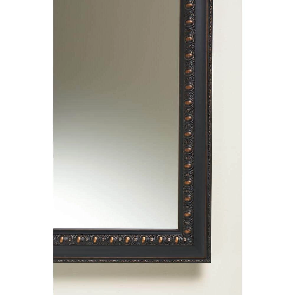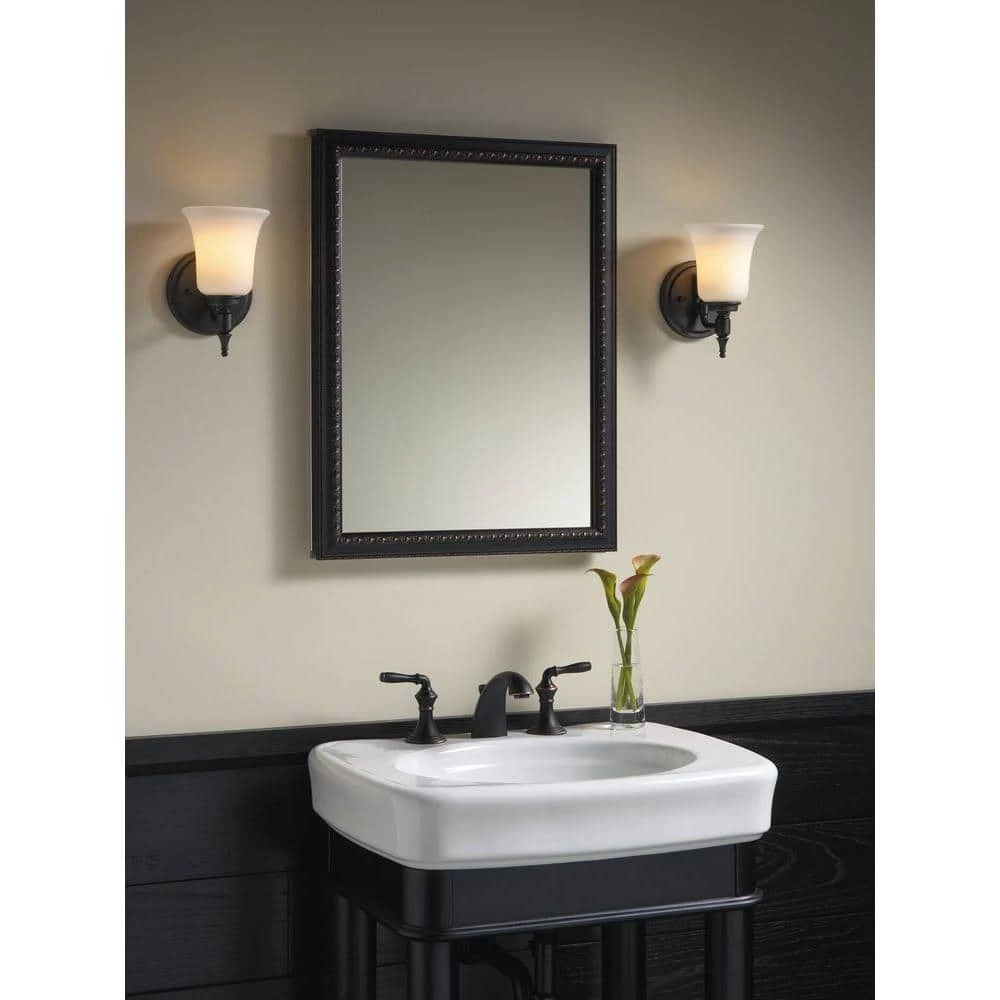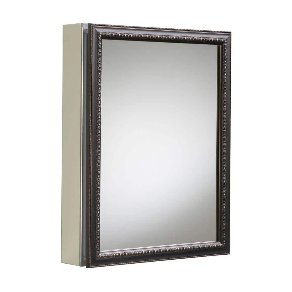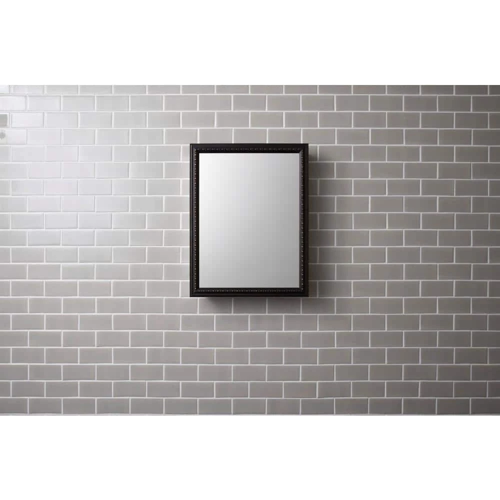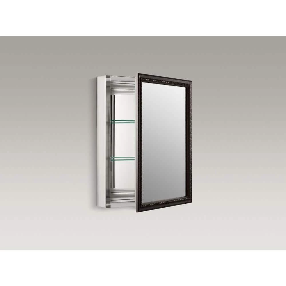 Showcasing elegant bronze detailing on its frame, this wall-mounted medicine cabinet features a reversible door that can be installed with a left- or right-hand hinge. Mirrors are positioned on the front and back of the door as well as the interior back of the cabinet. Two adjustable glass shelves hold your toiletries and bath items. Durable aluminum construction makes this cabinet rust- and rot-resistant.
