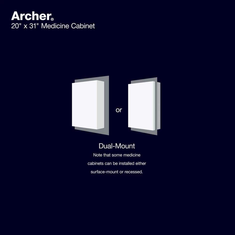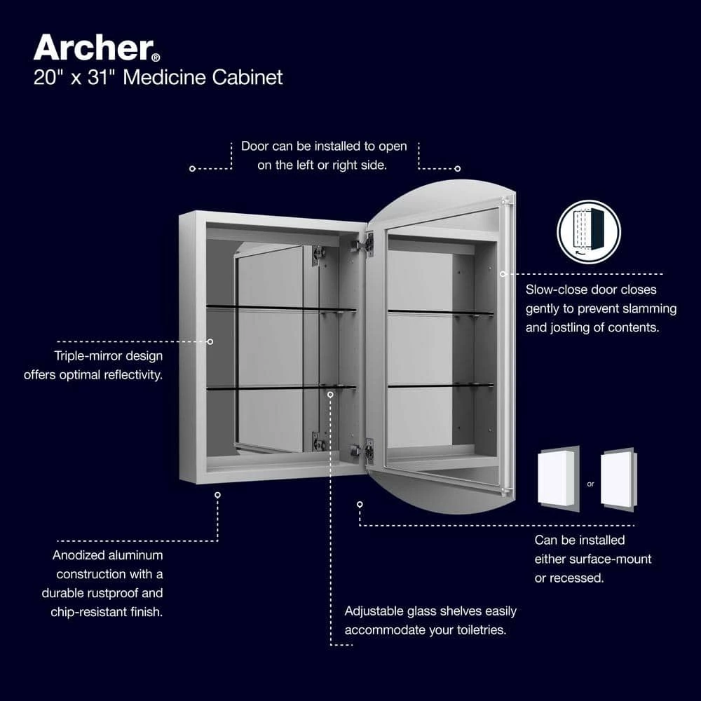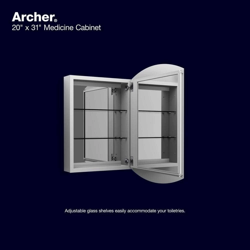 With its sleek anodized aluminum and glass construction, the Archer medicine cabinet provides a stylish complement to your bath or powder room. Mirrors are positioned on the front and back of the door as well as the interior back wall of the cabinet. Two adjustable glass shelves hold your toiletries and bath items. Durable aluminum construction also makes this cabinet resistant to rust and rot for lasting use.