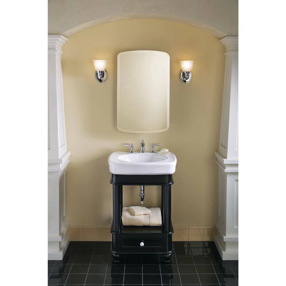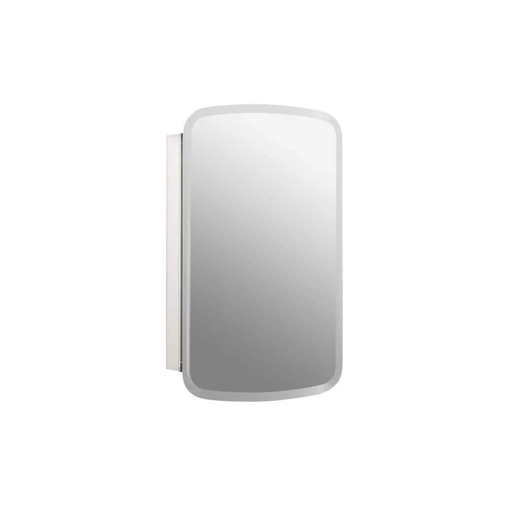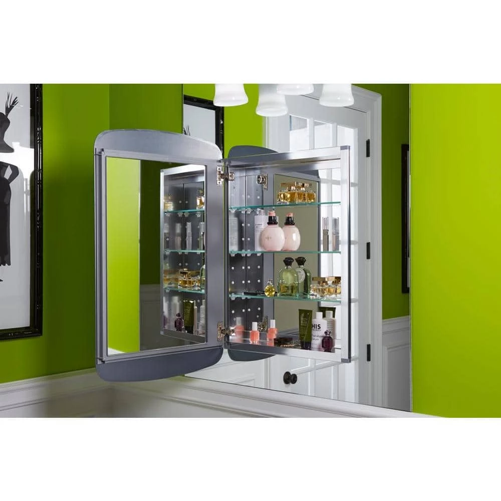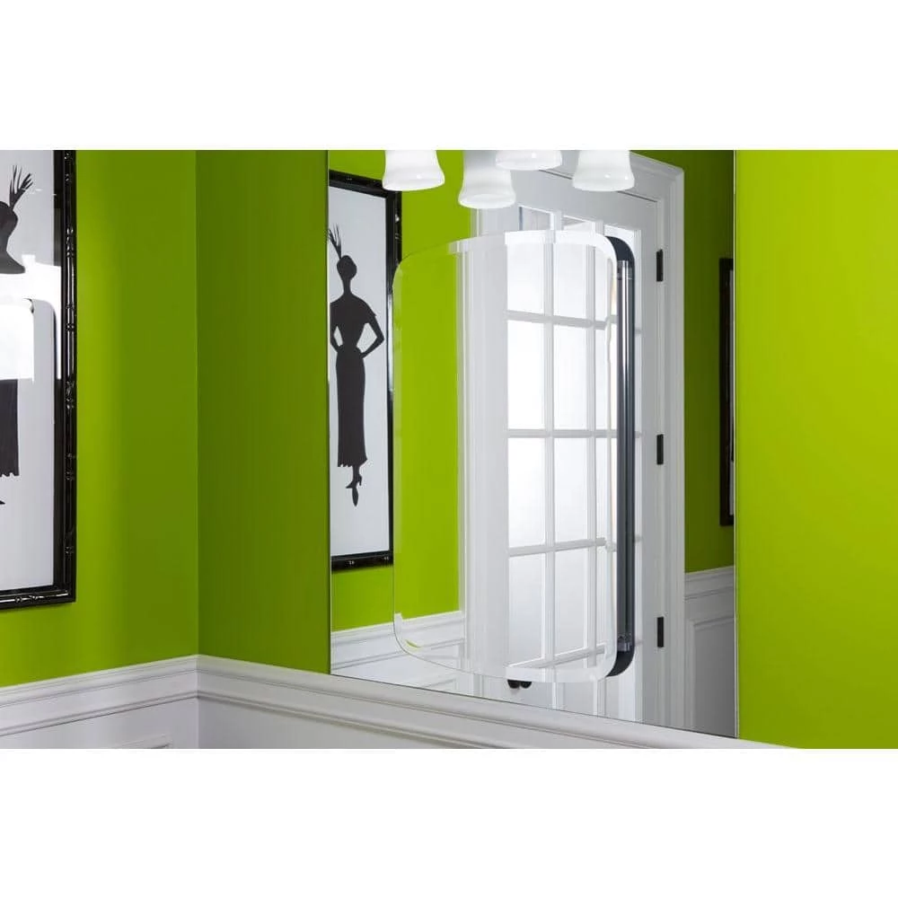 Showcasing a sleek, modern design, this medicine cabinet features a beveled frameless Bancroft door. Mirrors are positioned on the front and back of the door, as well as the interior back of the cabinet. Two adjustable glass shelves hold your toiletries and bath items. Durable aluminum construction makes this cabinet rust- and rot-resistant.