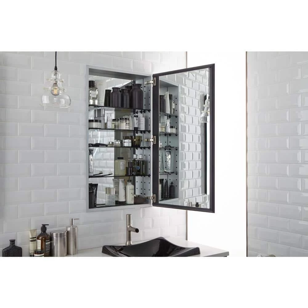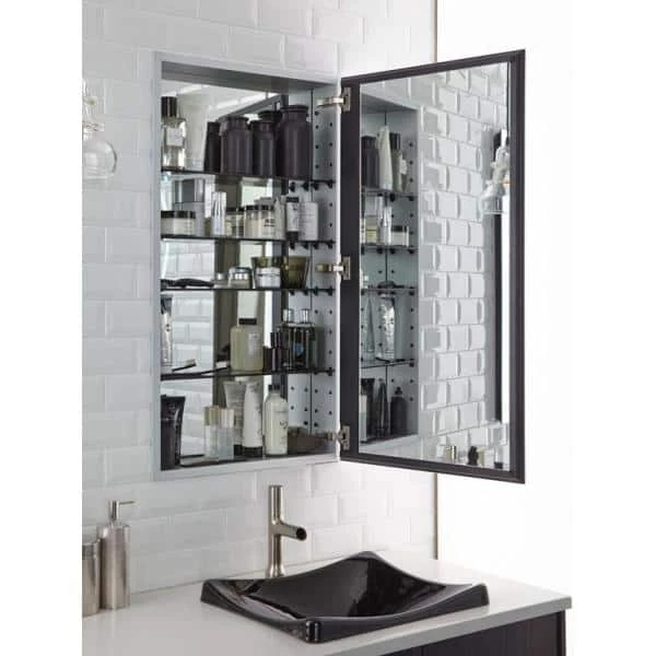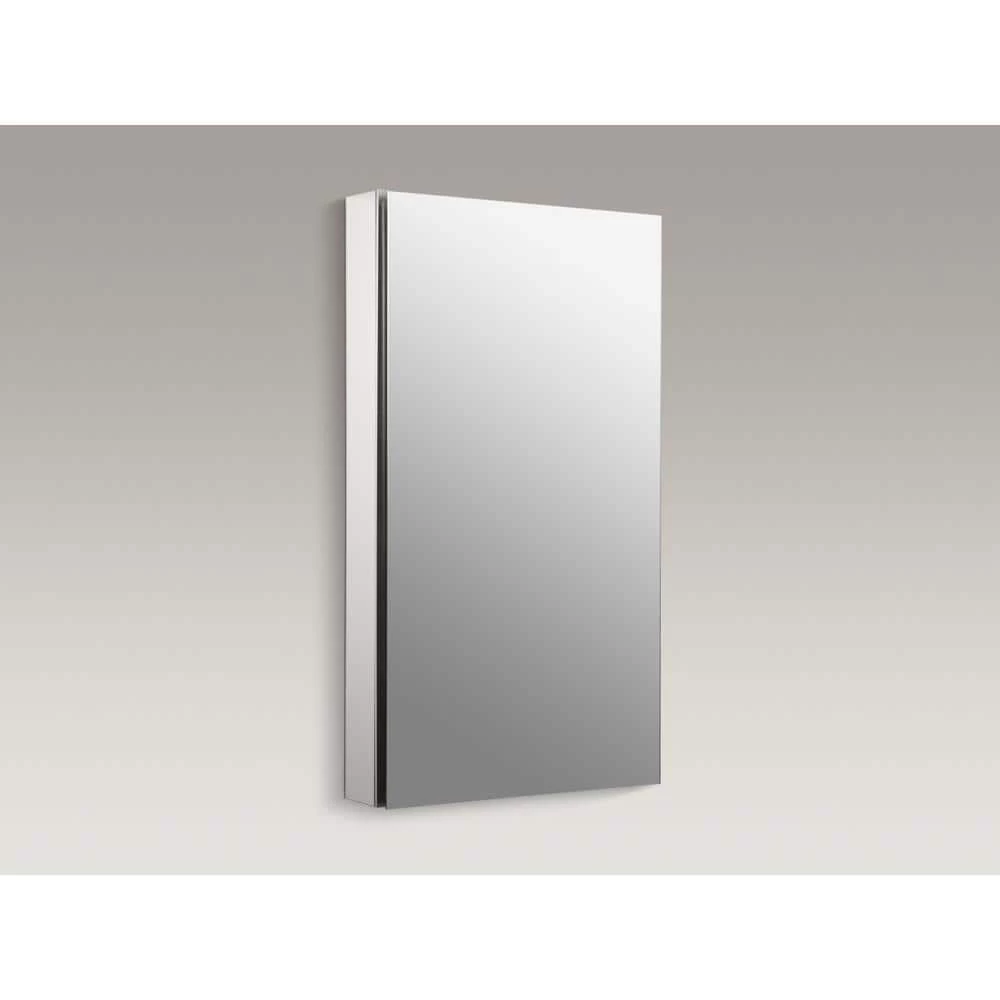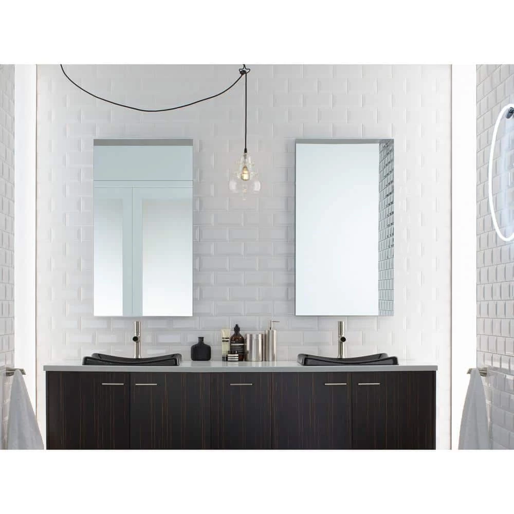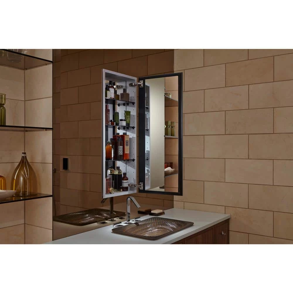 The Catalan mirrored cabinet features a tall, plain glass mirror that can be installed with a left or right hinge. The frameless, transitional design coordinates with almost any decor. Inside, four black tinted glass shelves provide flexibility and personalization when storing all of your toiletries. The aluminum construction ensures a durable, rust-free finish allowing for years of use in the bathroom. The flexible design also allows for recess- or surface-mount installations (side kits sold separately: K-2878).