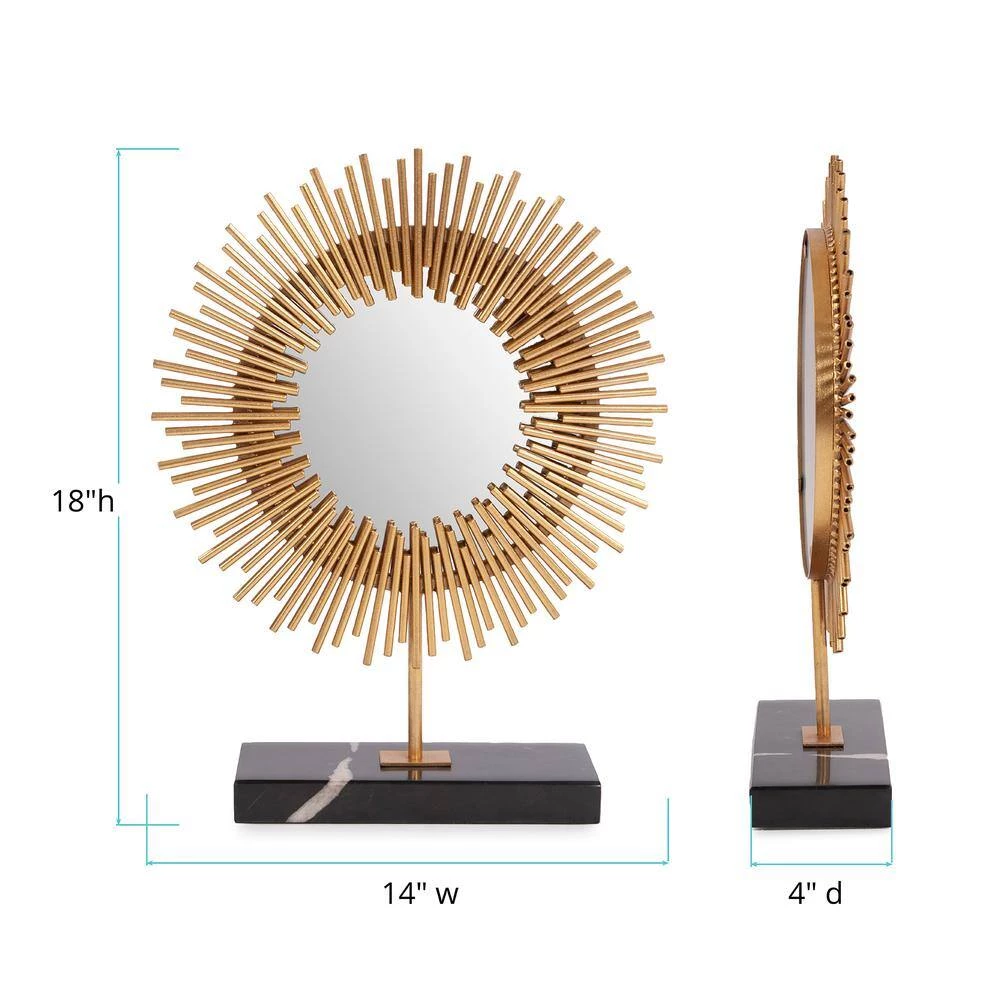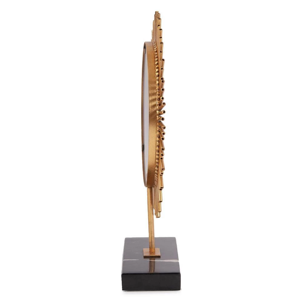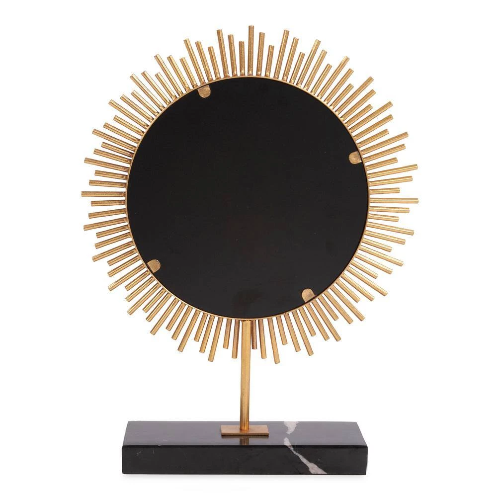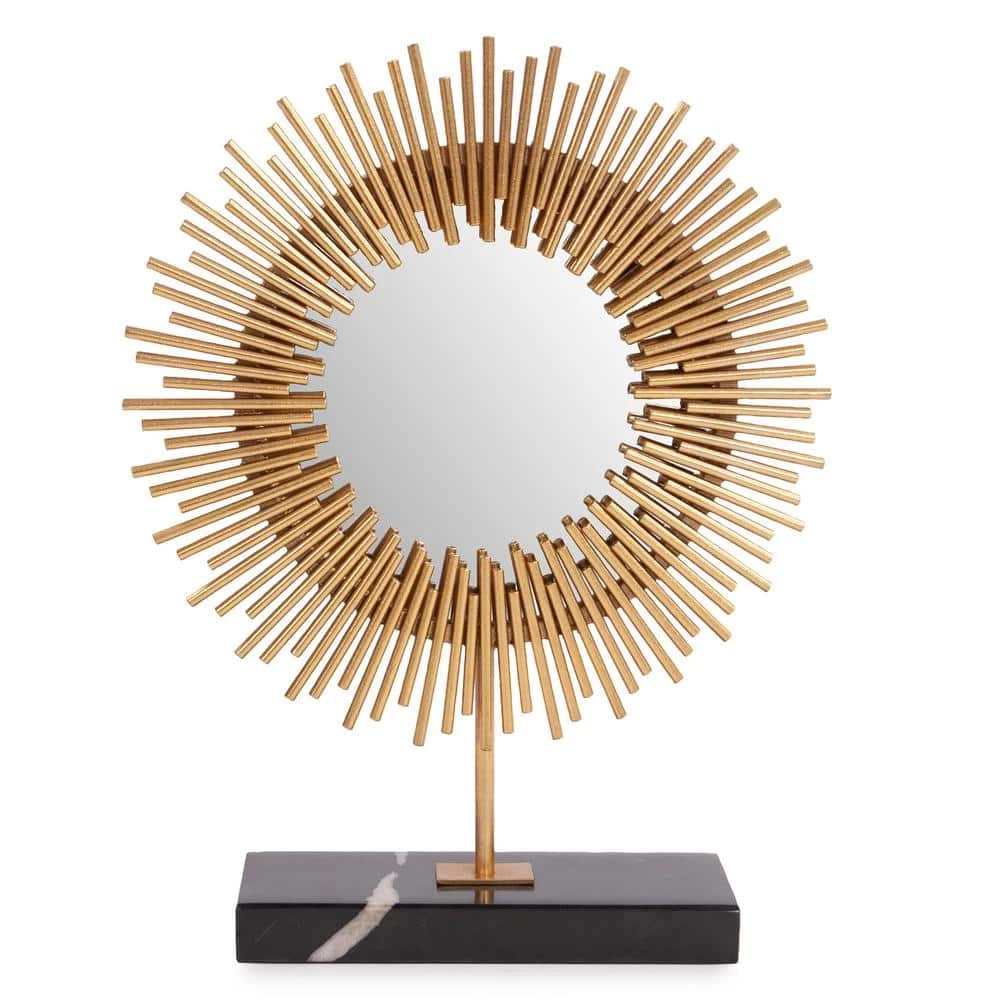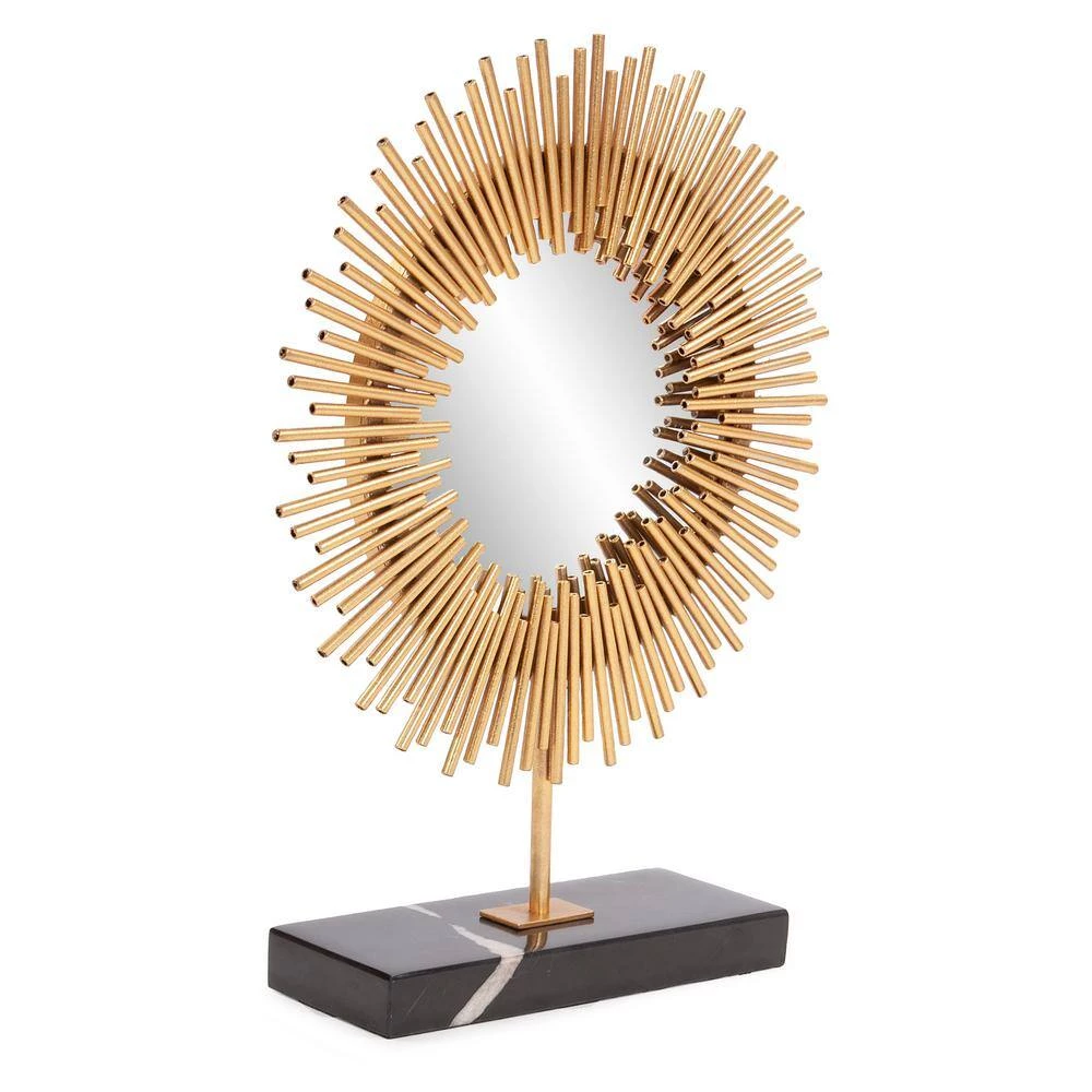 The Ra Table Top Mirror features a sunburst design of metal rods. The gold finish intensifies the radiating effect. The mirror is set on a black marble base.