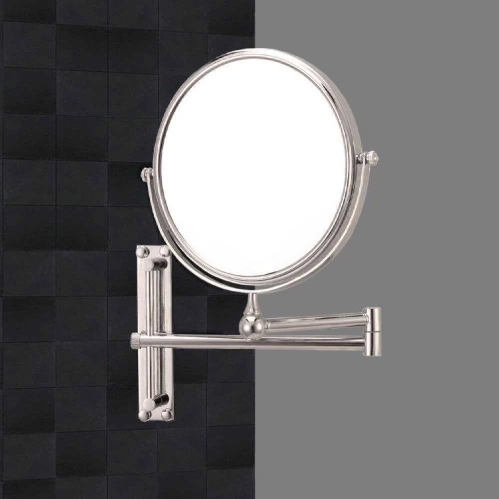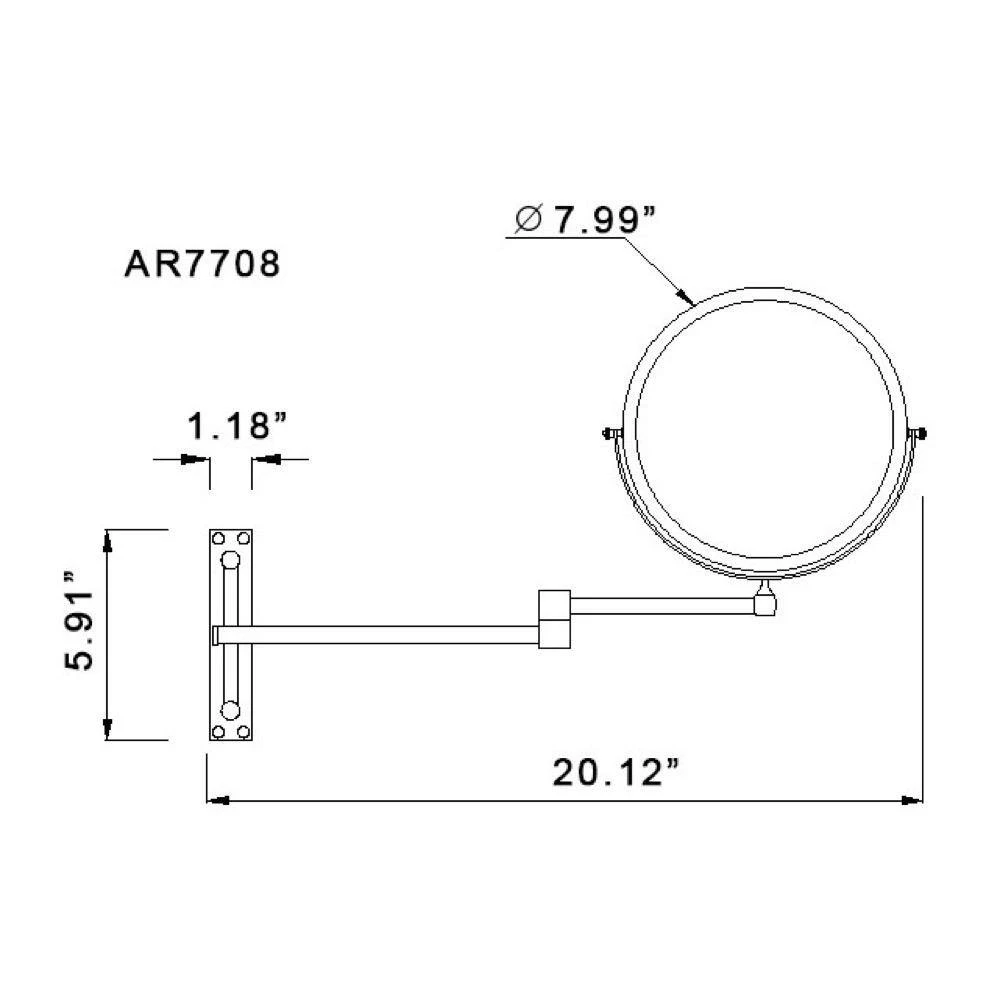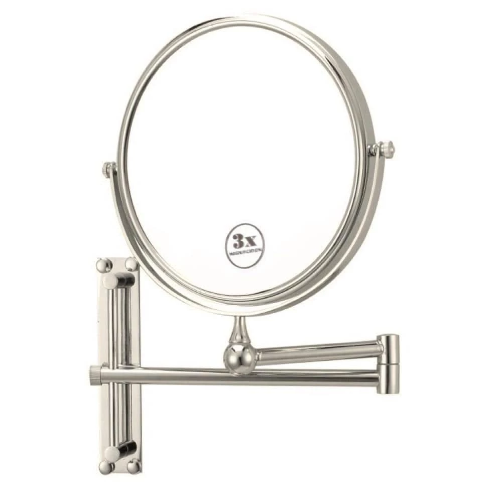 Made from high quality brass this round wall mounted makeup mirror is available in satin nickel. Its double-faced and comes with an extendable arm. With 3x magnification and 8″ round mirror face, its perfect for any contemporary design.