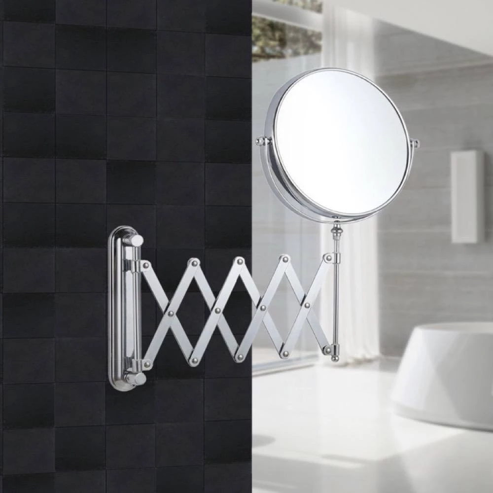 Double faced, extendable, and wall mounted, this makeup mirror also comes with 3x magnification. Its accordion style adjustable arm ensures the perfect position every time. Made of high-quality brass into a stylish round shape.