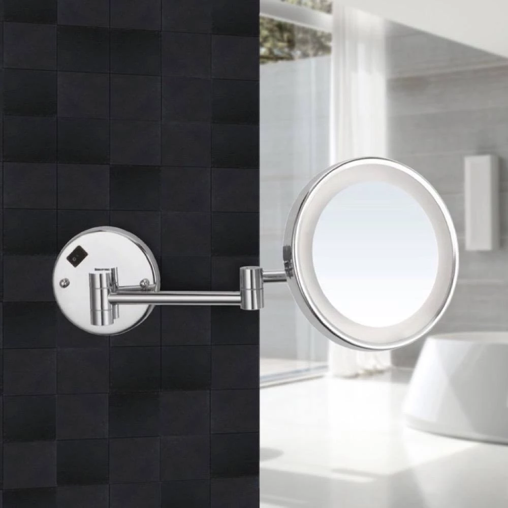 - Made from high quality brass this round wall mounted makeup mirror is available in chrome. Its double-faced and comes with an extendable arm. With 3x magnification and 8″ round mirror face, its perfect for any contemporary design.