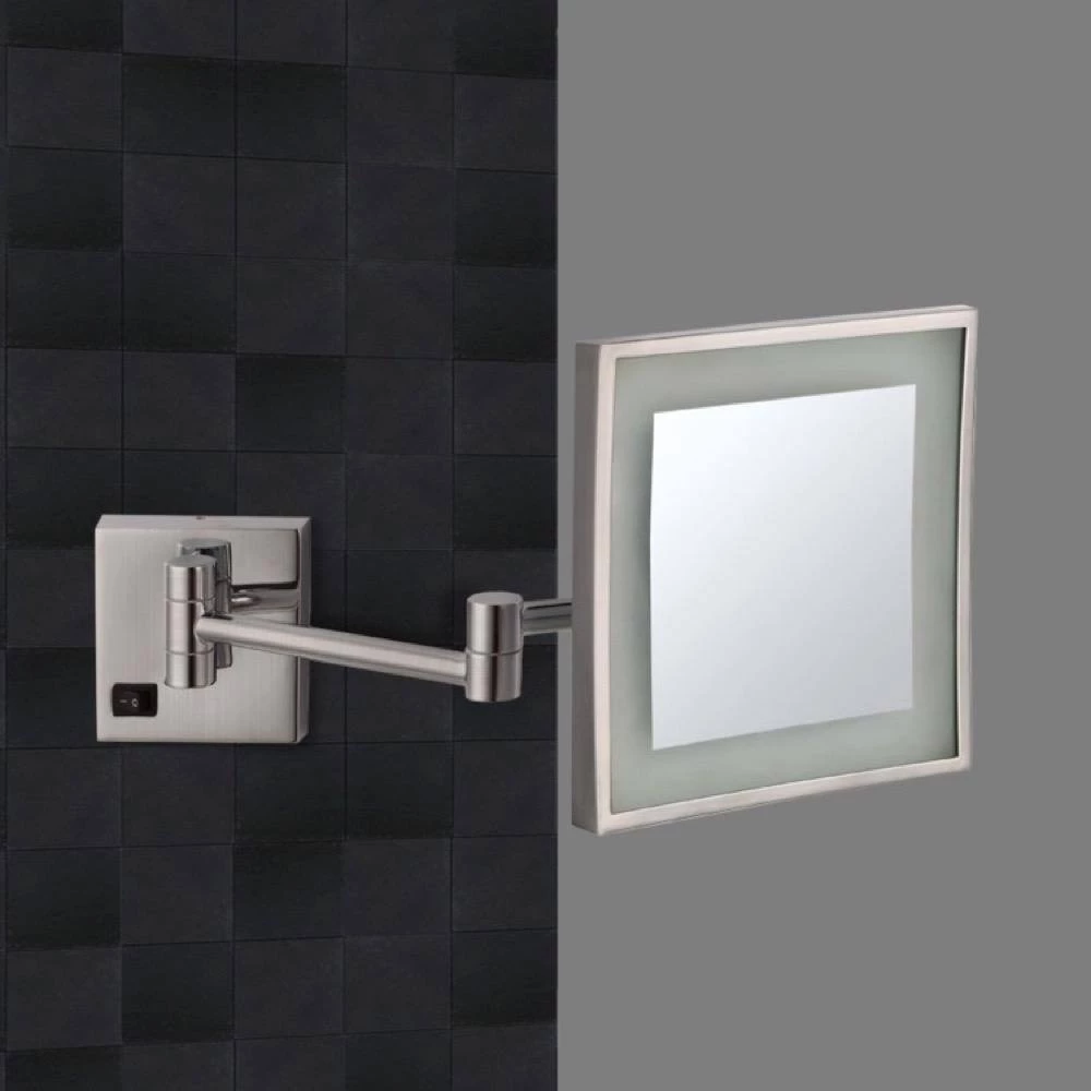 Perfect for modern settings, this wall mounted, adjustable, magnifying makeup mirror is made of high-quality brass and stainless steel and available in chrome or satin nickel finishes. Mirror is also available in 5x strong magnifications. This square single faced mirror features a built-in LED light and two movable arms for more rotational angles. This magnifying mirror is perfect for applying makeup or shaving.