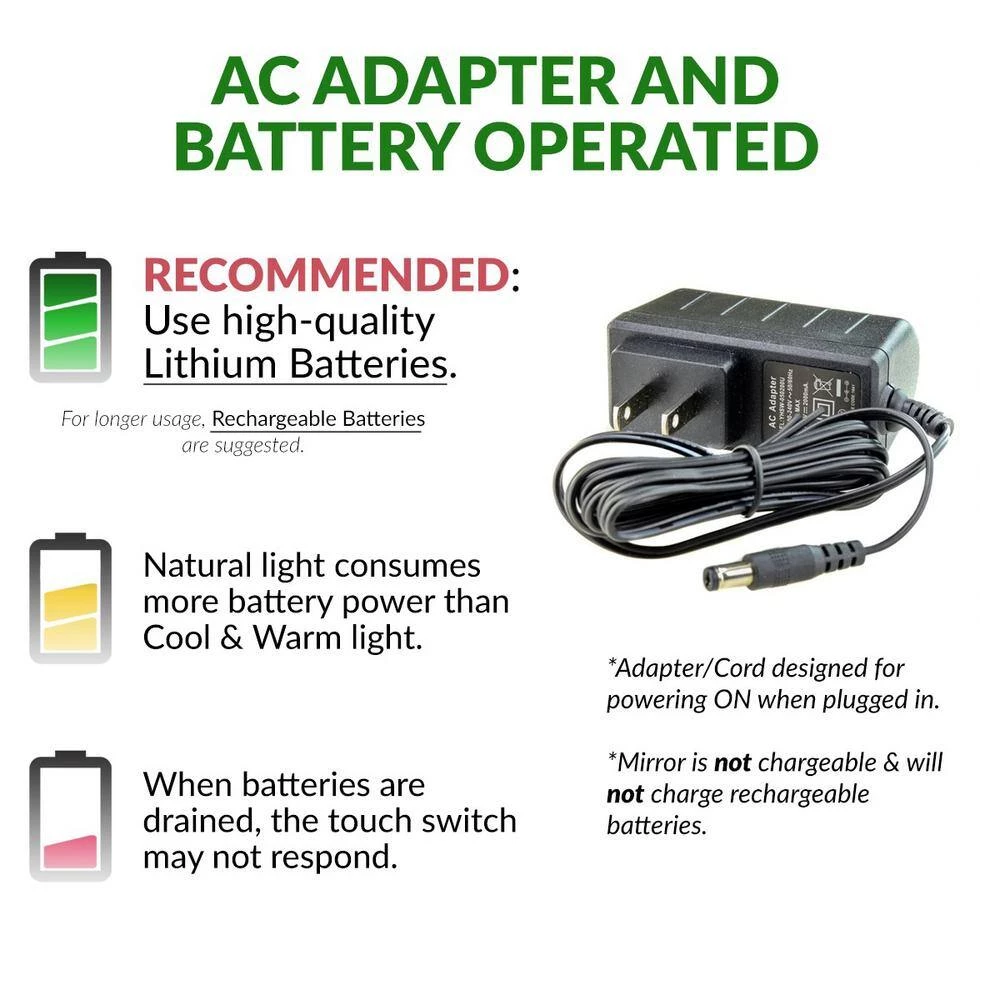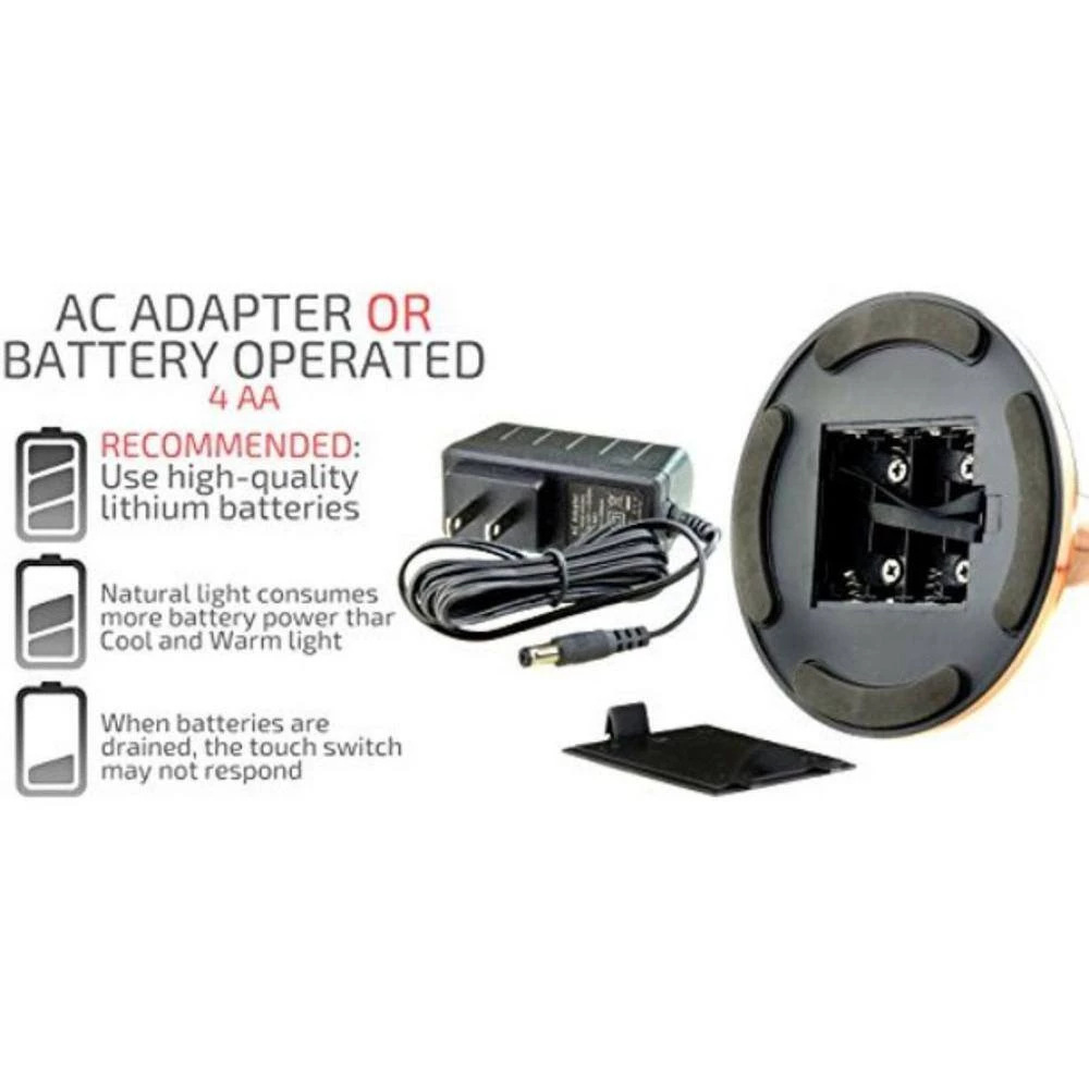 This cute adjustable makeup vanity with light mirror can be great for many decor, including vintage, Victorian, Hollywood, medical, or anything that involves beauty and self-care. This bathroom mirror with LED light is a classy addition for bathroom, bedroom, grooming, shaving and vanity needs. This countertop vanity makeup mirror gives a chic modern look for any master bath, hotel, dental, and shower needs. It is operated by 4 AA batteries (not included) or AC Adapter (included). This magnified electric lit looking glass allows you to see up close so you can absolutely see your eyebrow and facial hair, much more clearly. Use it at home or as a portable option for any traveling, big or small. It is sure to bring an influx of positive high end energy to any room for everyone, including girls, boys and kids. Its ability to magnify, show off your accessories and continue a salon & spa experience at home makes this a consumer preferred product.