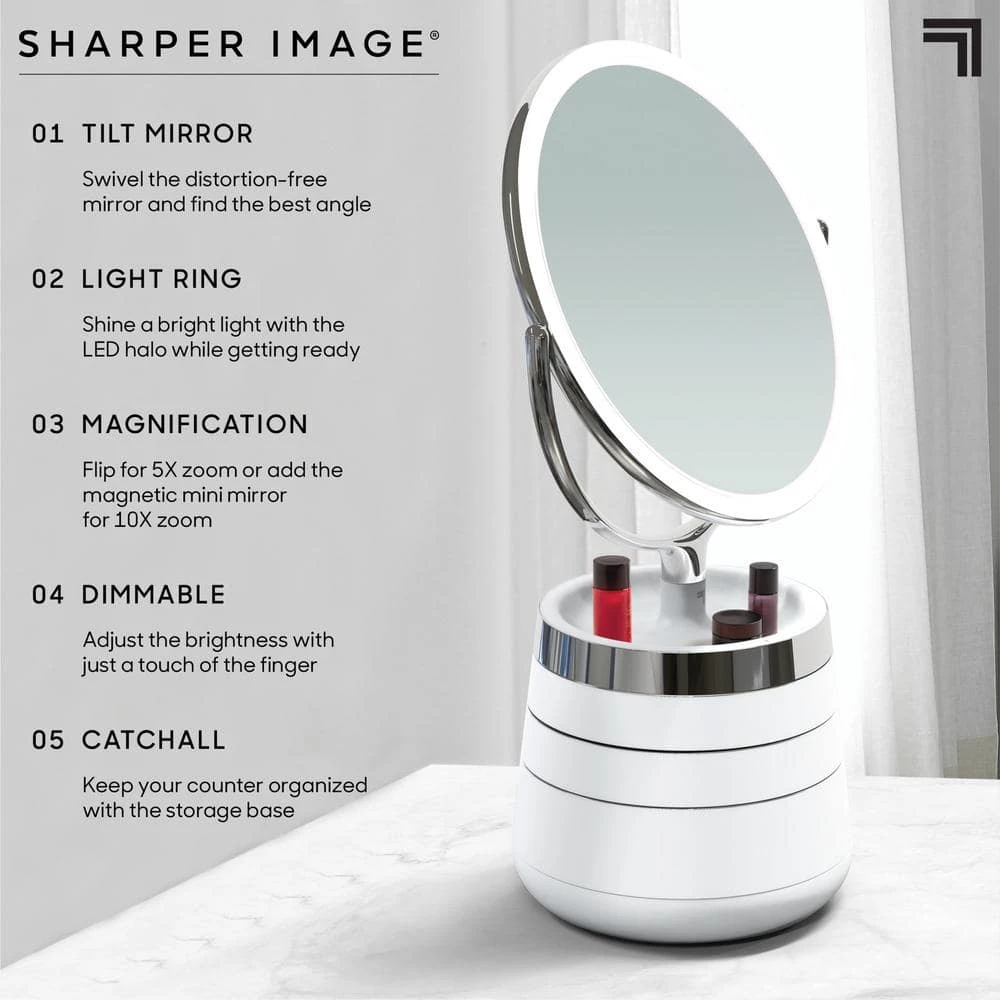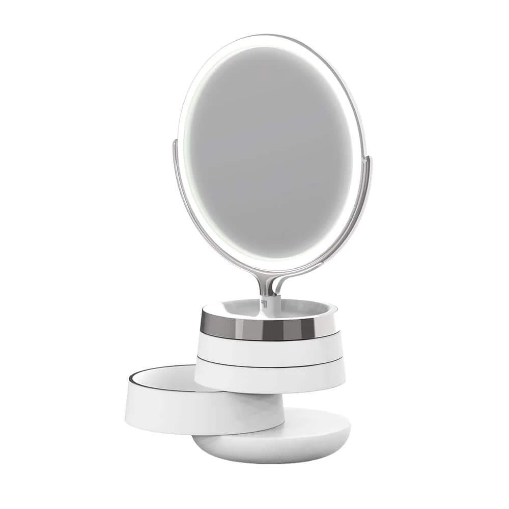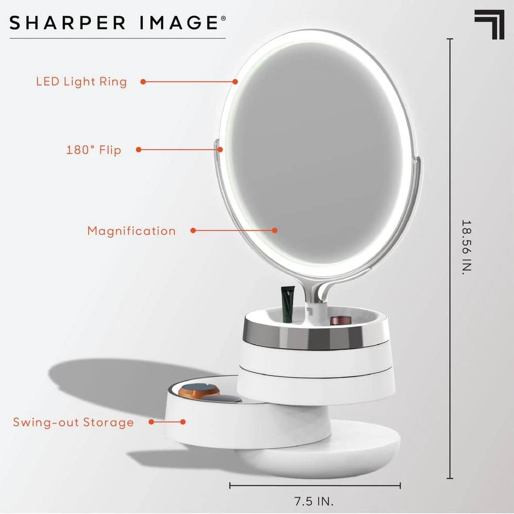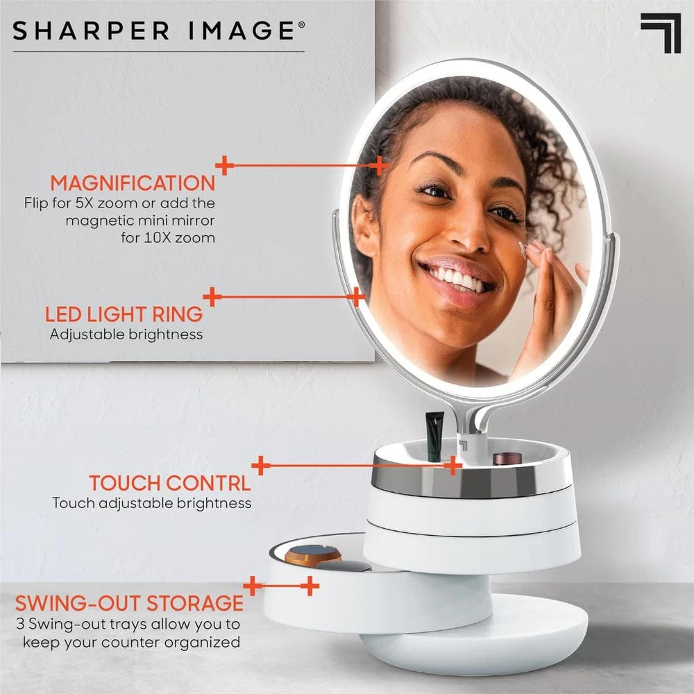 Find your perfect angle with a distortion-free vanity mirror featuring 5x and 10x zoom. The built-in trays swing out for clever, stylish storage to keep your counter organized, and the LED ring light provides perfect illumination. The future is bright with sharper image.