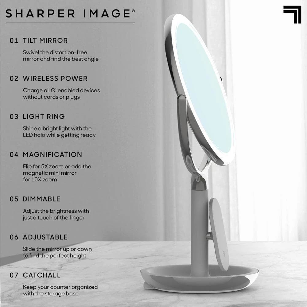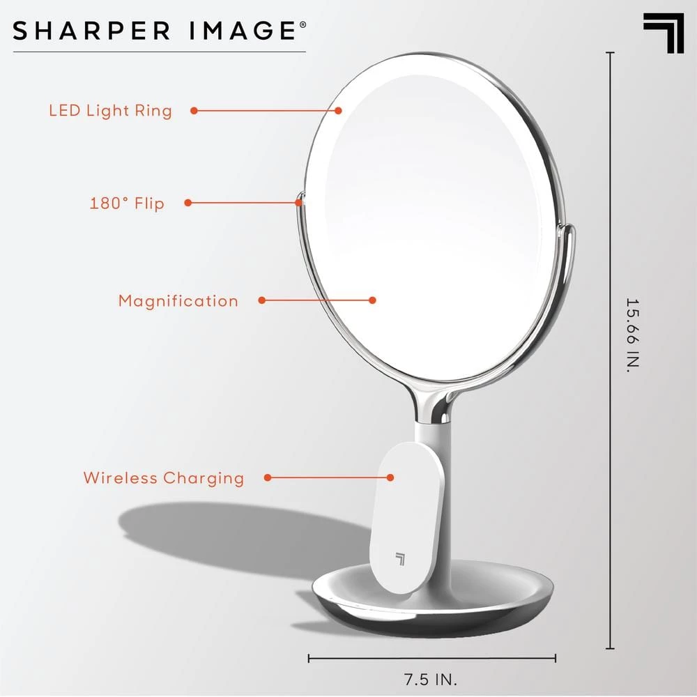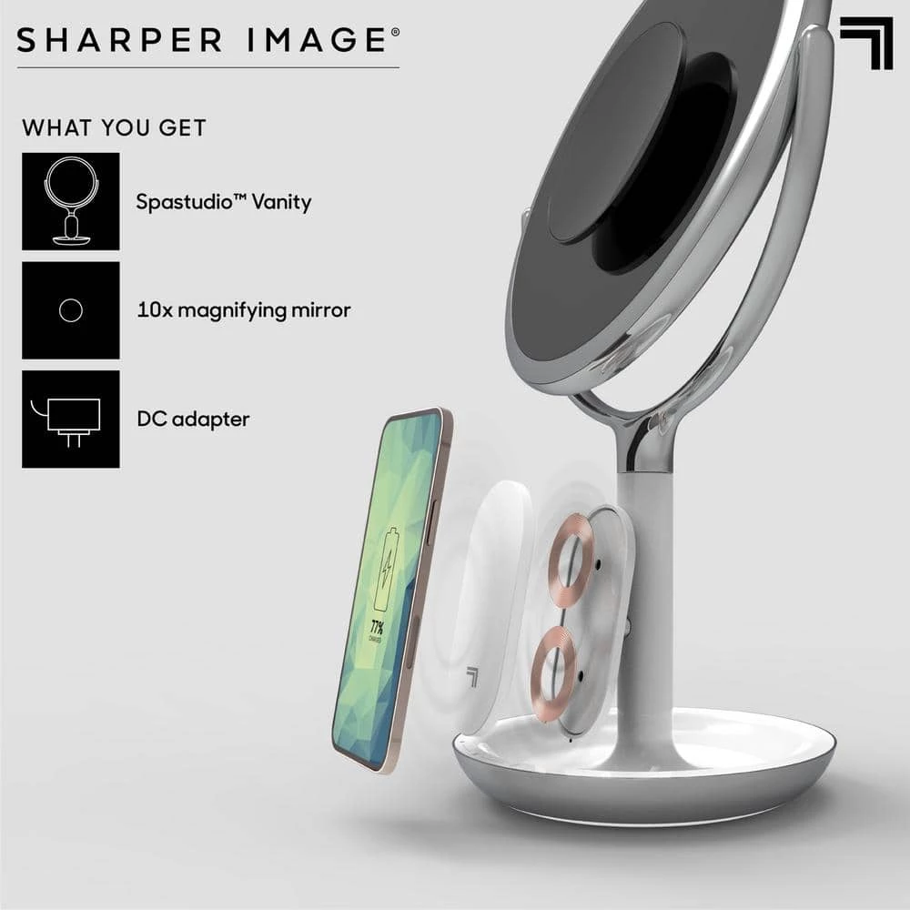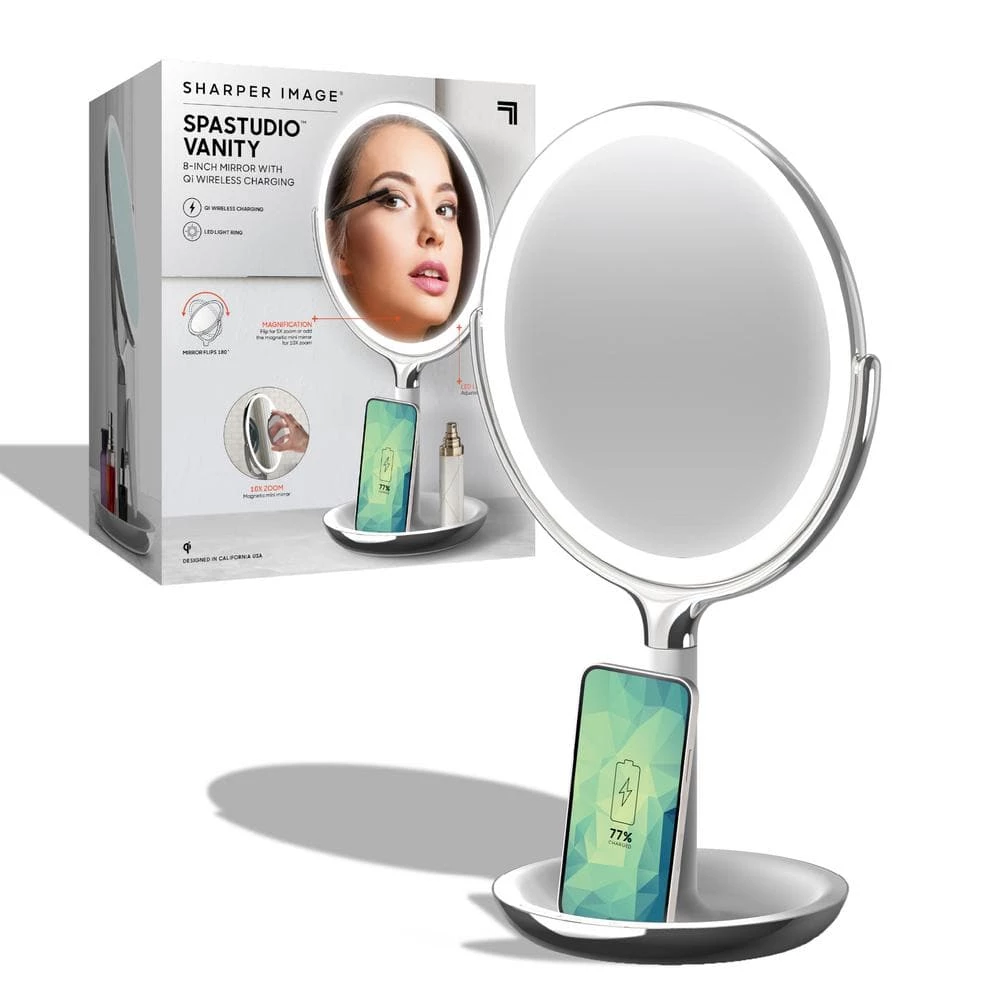 The SpaStudio Vanity Mirror from Sharper Image includes wireless charging for all Wi-enabled devices. The mirror features a dimmable LED light ring halo and distortion-free swiveling to ensure you look good from every angle. Adjust the height of the mirror while taking a closer look with the 5X and 10X magnification features.