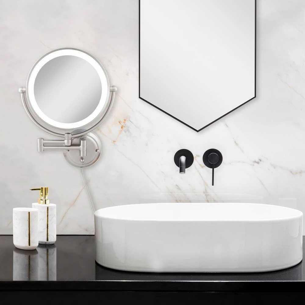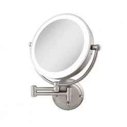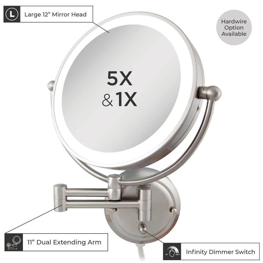 Renovate your space and routine with Zadro’s Glamour Wall Mount Mirror, the largest dual-sided lighted wall mount mirror on the market. The powerful 5X magnification side is great for details and touch-ups, while the convenient 1X side provides an immaculate view of your entire face for everyday needs. The vivid fluorescent surround light emulates natural daylight with even light dispersion at any angle. The infinity dimming knob on the base easily allows you to soften and brighten the lighting level to your exact preference. An 11 in. dual extending arm extends out from the wall that allows you to bring the mirror right to where you need it, then collapse the mirror back in place for a streamlined decor look.