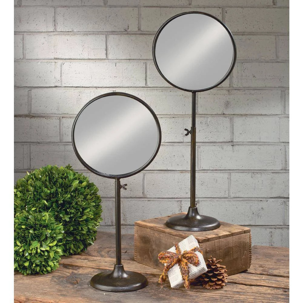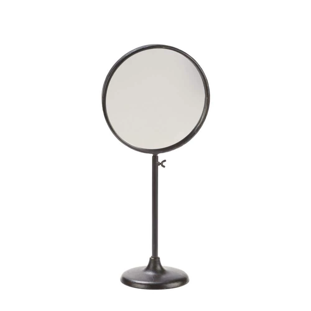 Add a sophisticated industrial touch to your vanity or dresser with this adjustable mirror. The burnished brown piece is adjustable from 19″ tall up to 25″. This piece is perfect for your makeup, hair styling, and shaving needs. Use this versatile piece on dressers, desks, and vanities. The burnished dark brown finish and modern center piece creates a bold, sophisticated atmosphere. The mirror does not have any magnification and does not tilt.