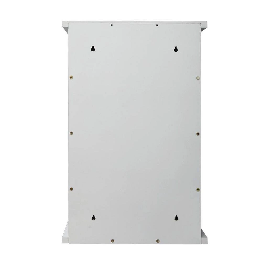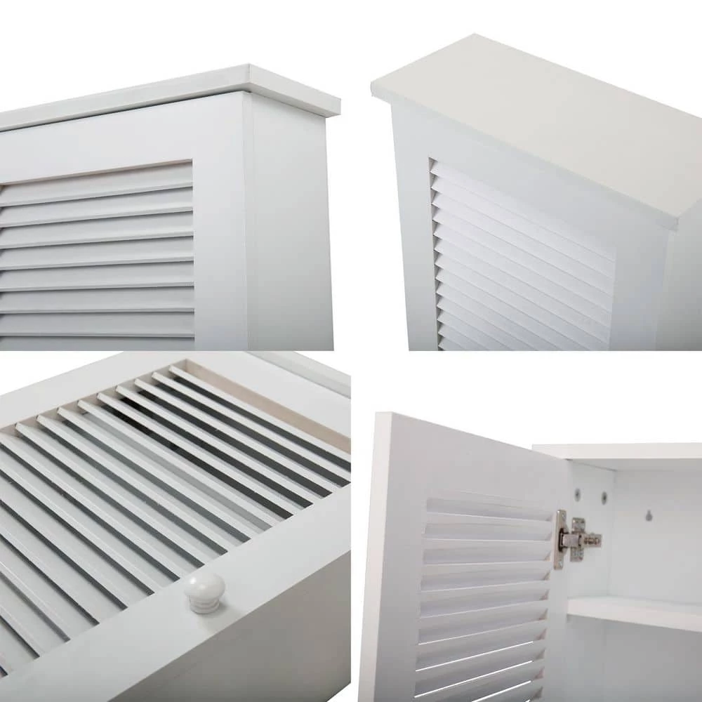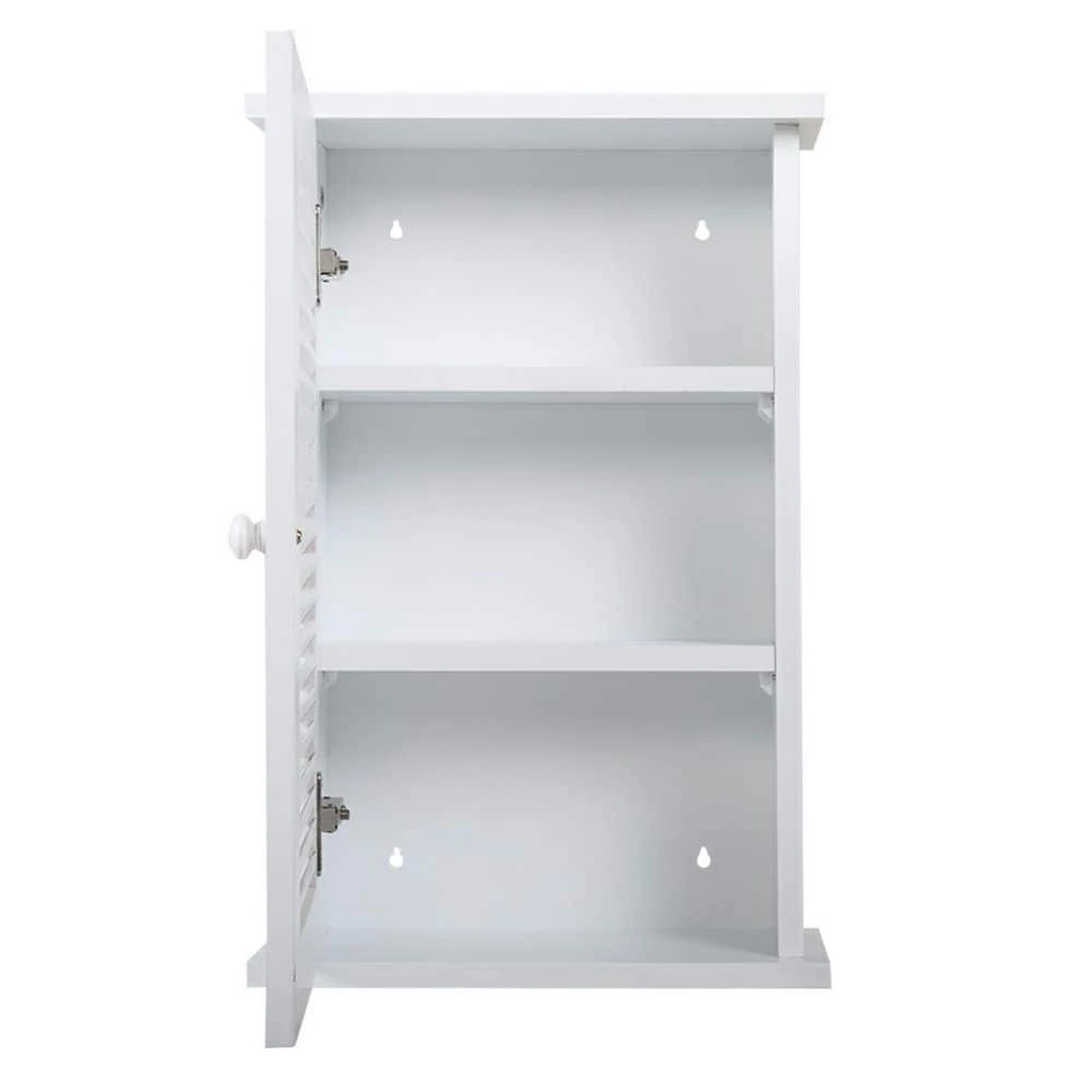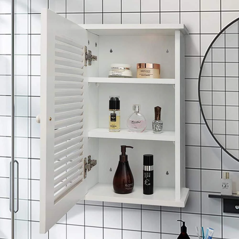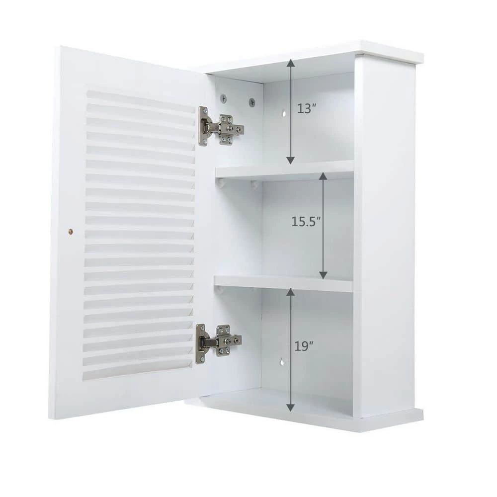 Decorate your limited living space with this modern bathroom medicine cabinet, which showcases a savvy storage solution for smaller bathrooms/rooms. Made from sturdy MDF panels with a bright white finish, this wall-mounted storage cabinet enhances the clean and tidy aesthetic of your living space. A single louvered door attached to heavy-duty hinges provides good ventilation inside, and there are a total of 3 storage compartments to organize your medicine bottles, soap, mouthwash cups, cables, utensils, and more.