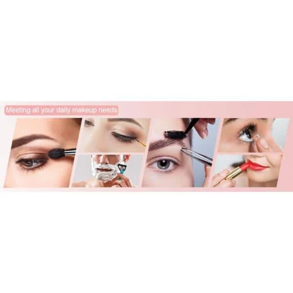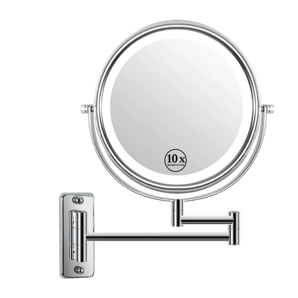 This 8 in. 2-sided 1x/10x HD magnifying mirror can 360° rotate freely. The length of extension arm is 12 in. It has 3-adjustable color lighting mode, white light, warm light, natural light. The mirror has touch screen button to adjust light brightness, press it shortly for on/off, long press to adjust brightness from 10% to 100%. It can be powered by USB cable or 4-AAA battery. (A charging cable is included; battery is not included). Rechargeable battery is recommended. you can charge the rechargeable battery by USB cable, recycle use.