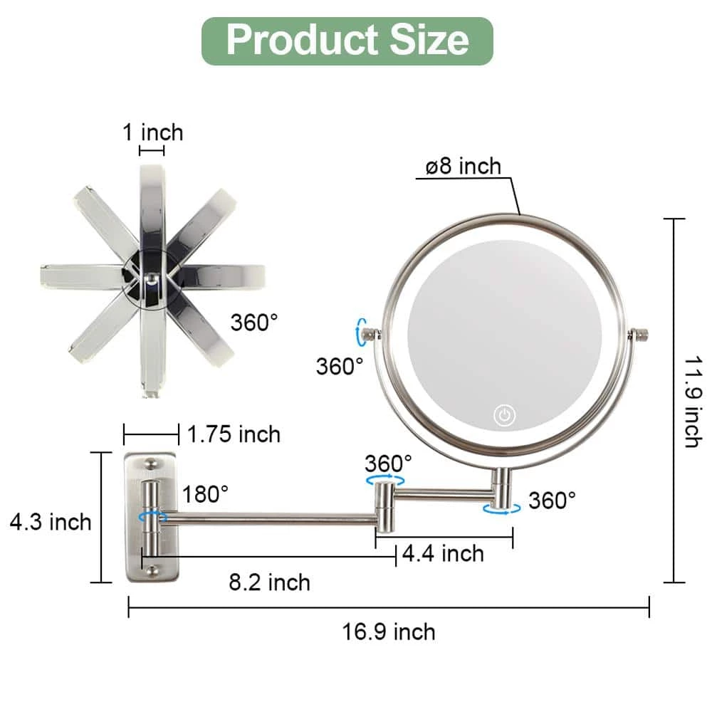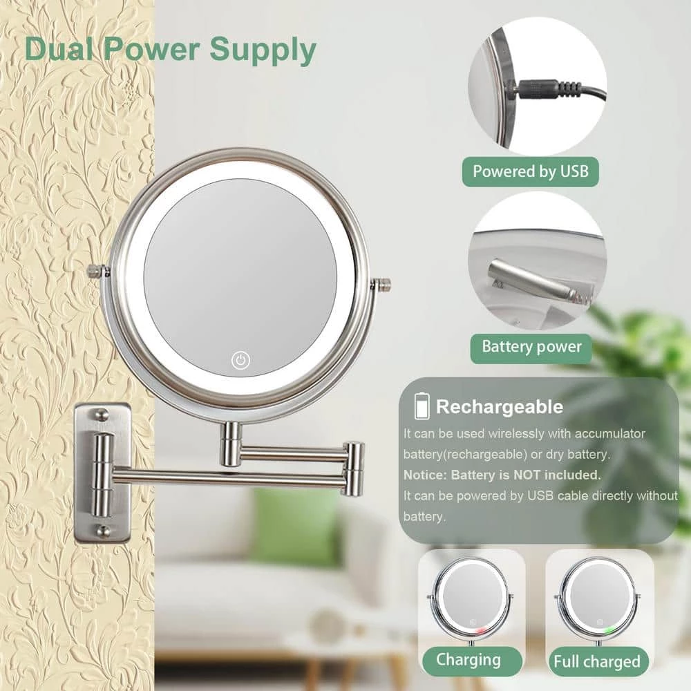 This 8 Inch Two-sided 1x/10x HD magnifying mirror can 360 degrees rotate freely. The length of extension arm is 12″. It has 3 adjustable color lighting mode, white light, warm light, natural light. The mirror has touch screen button to adjust light brightness, press it shortly for on/off, long press to adjust brightness from 10% to 100%. It can be powered by usb cable or 4*AAA battery. (A charging cable is included; battery is NOT included). Rechargeable battery is recommended. you can charge the rechargeable battery by USB cable, recycle use.