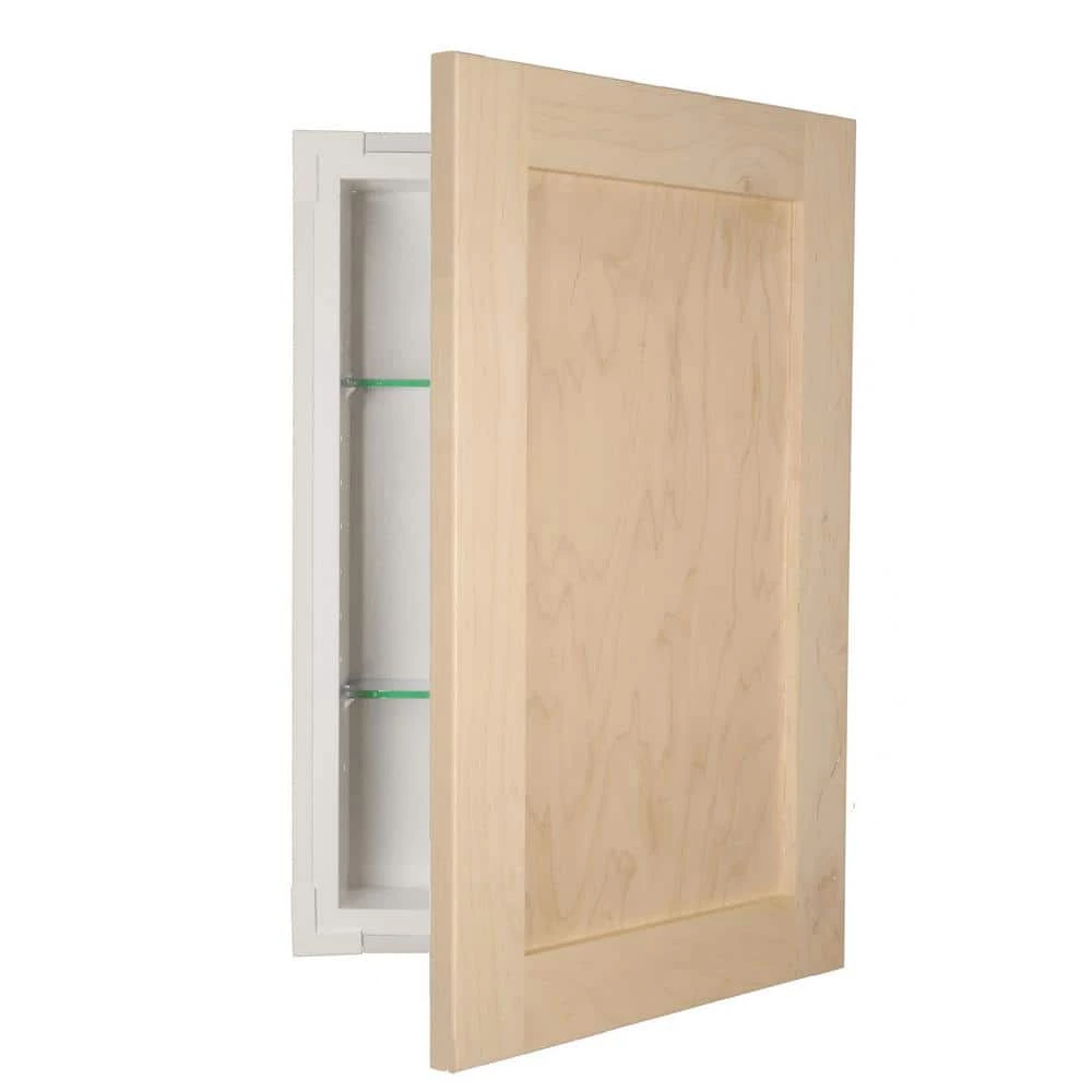 Perfect for any bathroom. Recesses in the wall between the studs, and simply screws to the studs on each side. Only the door is outside the wall for a clean, modern look. 3 glass shelves inside are fully adjustable. Because the shelves slide in the supports, they cannot fall off or move. Optional shelf retainers can prevent the shelves from coming out unless you want them to perfect in Assisted Living, Skilled Nursing, Memory Care environments. Blum concealed hinges with soft close built in. Box is solid white wood pine, Shaker style door is solid maple. The box is painted white inside. Thin plastic trim surround on the box covers the rough edges of your drywall opening, but you will only see that trim surround when you open the door covers it when closed. The box is 3.5 inches deep inside and gives you plenty of usable depth, but fits in standard 2 x 4 walls. Door only projects about 1 inch from the wall when closed. Door is not drilled for a knob, so it is reversible to open either Left or Right nickel knob is included but not installed. Completely assembled. All you need to do is put one screw in each hinge to mount the door. Then insert it in the wall and screw it to the studs with included screws. If you are replacing a current cabinet, measure your wall opening. It must be 14 in. x 28 in. x 4 in inches deep. If your opening is larger, the trim surround won’t cover it. If your opening is smaller, the box will not go into the wall.