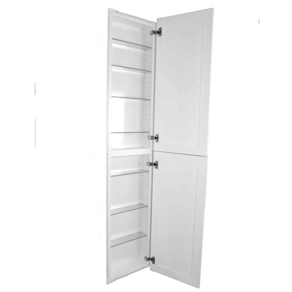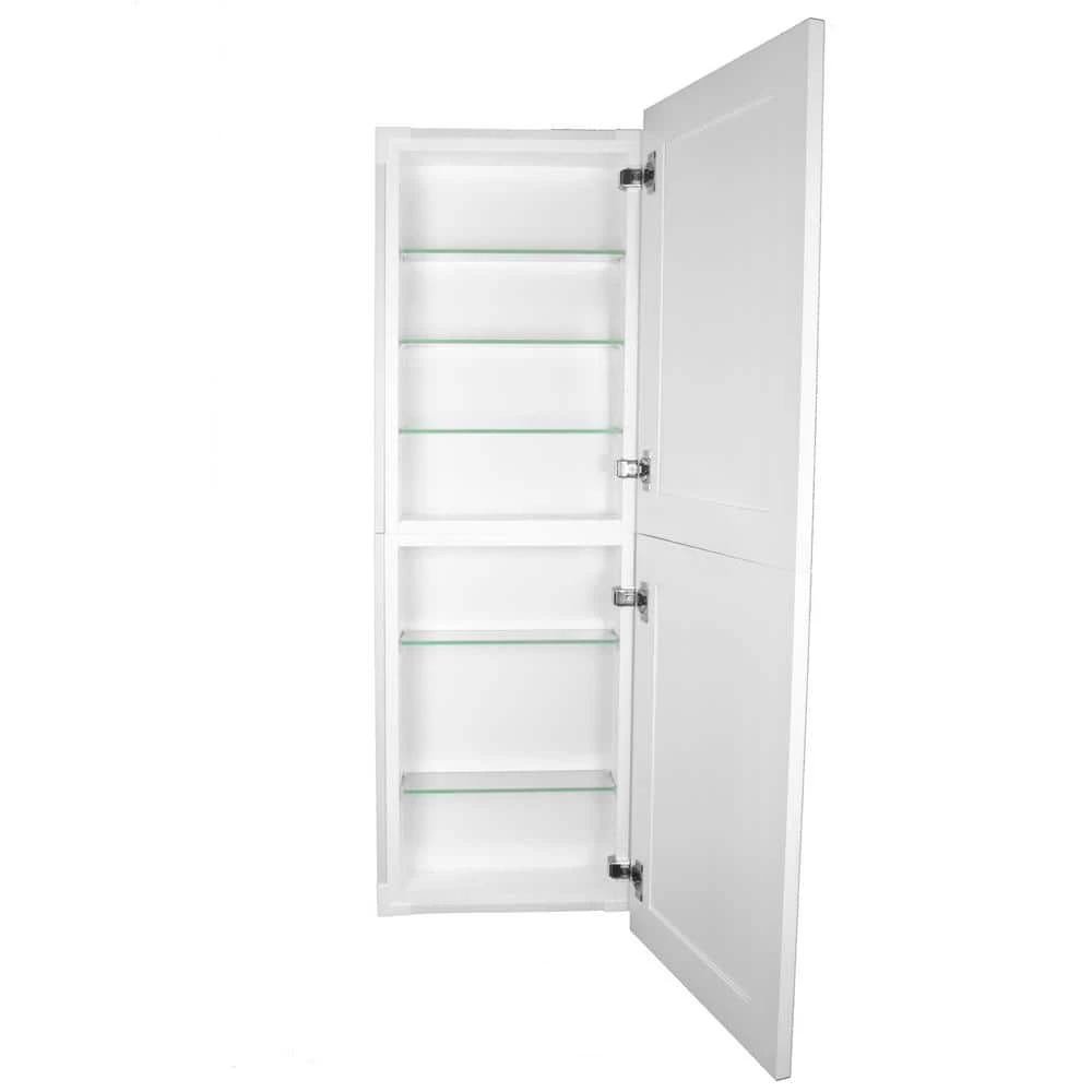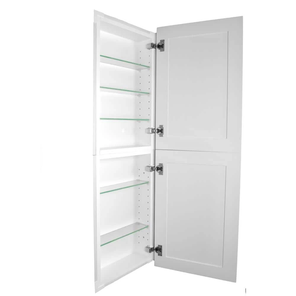 Unique Frameless Medicine/Pantry cabinet available in six heights and multiple finishes, Perfect for any bathroom or kitchen. Recesses in the wall between the studs and simply screws to the studs on each side of the opening. Only the door is outside the wall, so there is no chunky frame to ruin the clean and modern look. 5-fully adjustable shelves are included on the 44 model. Patented design keeps each shelf in place. Shelves slide in the supports, so the shelves can’t fall off or move. Blum concealed hinges with soft close built in assures the door will never slam shut. Solid Pine box with a Shaker style door in solid maple. We have painted the inside of the box white, so you don’t have to. 3-versions to choose from 1) get your door unfinished, primed or white. Thin plastic trim surround on the box covers the rough edges of your drywall opening, but you will only see that trim surround when you open the door the door covers it when closed. The box is 3.5 in. deep inside and gives you plenty of usable depth, but fits in standard 2 in. x 4 in. walls. The door only projects about 1 from the wall when closed. The door is NOT drilled for a knob, so it is reversible to open either Left or Right nickel knobs are included but not installed. Completely assembled, all you need to do is put one screw in each hinge to mount the door. Then insert it into the wall and screw it to the studs with included screws.