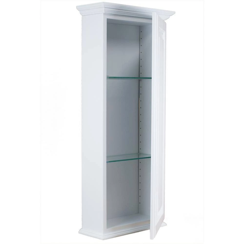 Mounts on the wall with steel mounting brackets inside for an easy installation. With two mounting methods, there is no need to worry about where the studs are in the wall. Four fully adjustable glass shelves slide into our patented shelf supports so they don’t tip or rock. Raised panel door sits on concealed hinges with soft close feature, door is reversible so you can mount it to open either direction. Perfect as a medicine cabinet, spice cabinet, or storage cabinet anywhere. OVERALL Measurements are 36.5 in. H x 17 in. x 3.25 in. D. You’ll have nearly 2.5 in. D INSIDE the cabinet. White enamel finish. Solid pine cabinet box with solid maple door.