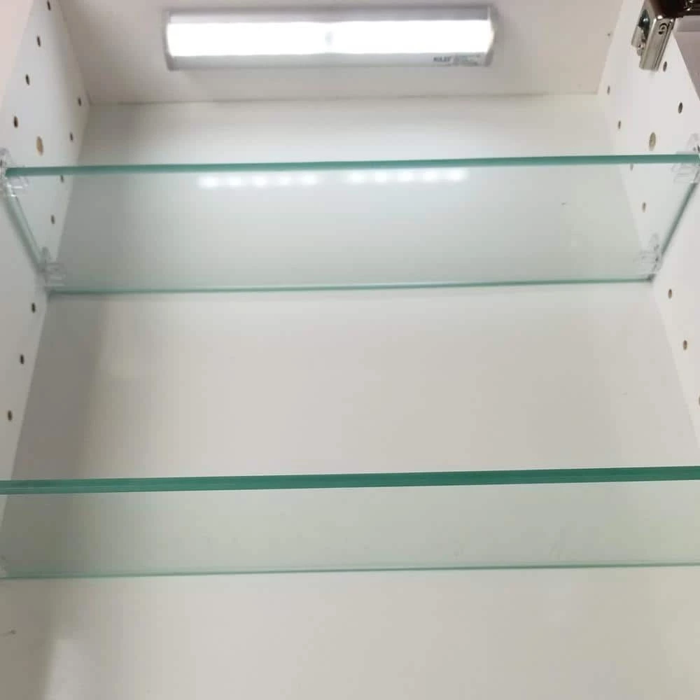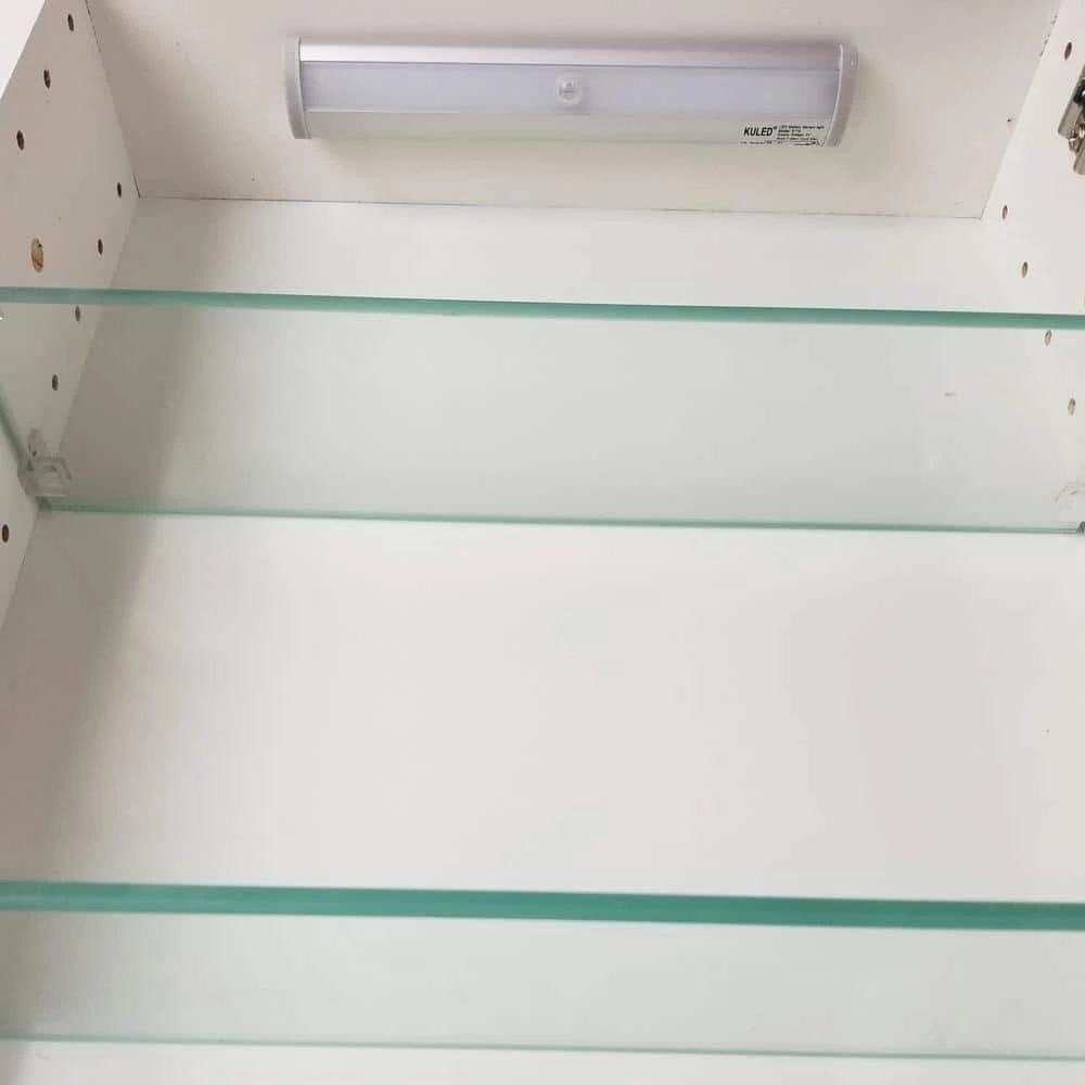 Perfect for any bathroom. Recesses in the wall between the studs, and simply screws to the studs on each side of the opening. Only the door is outside the wall. Fully adjustable glass shelves inside. Our unique, patented design of shelf supports keeps each shelf in place. Concealed hinges with soft close built in assuring the door will never slam shut but softly close on its own instead. The box is solid pine and the Slab panel style door is MDF. We’ve painted the inside of the box white, so you don’t have to. The box is 3.5 in. deep inside and gives you plenty of usable depth, but fits in standard 2×4 walls. Cabinet box is 12.5 in. wide inside. The door is reversible to open either Left or Right. Completely assembled! All you need to do is put one screw in each hinge to mount the door. Then insert it into the wall and screw it to the studs with included screws. If you are replacing a current cabinet, measure your wall opening. White plastic trim surround covers the rough edges of your opening up to 1/2 in. all around. The door covers the trim surround when closed so the only thing you see outside the wall is the door itself. Motion sense battery-operated LED light kit included. Just open the door and the light comes on. Close the door and the light goes off. Perfect in the middle of the night so you won’t wake your partner. The door is primed and ready to be painted.
