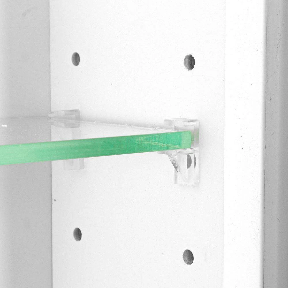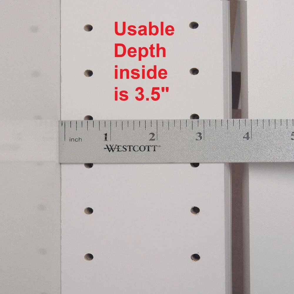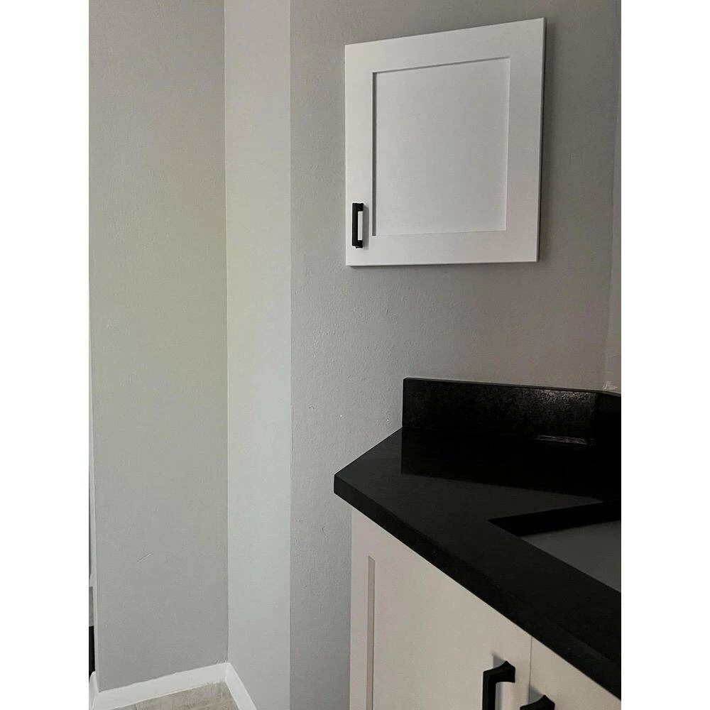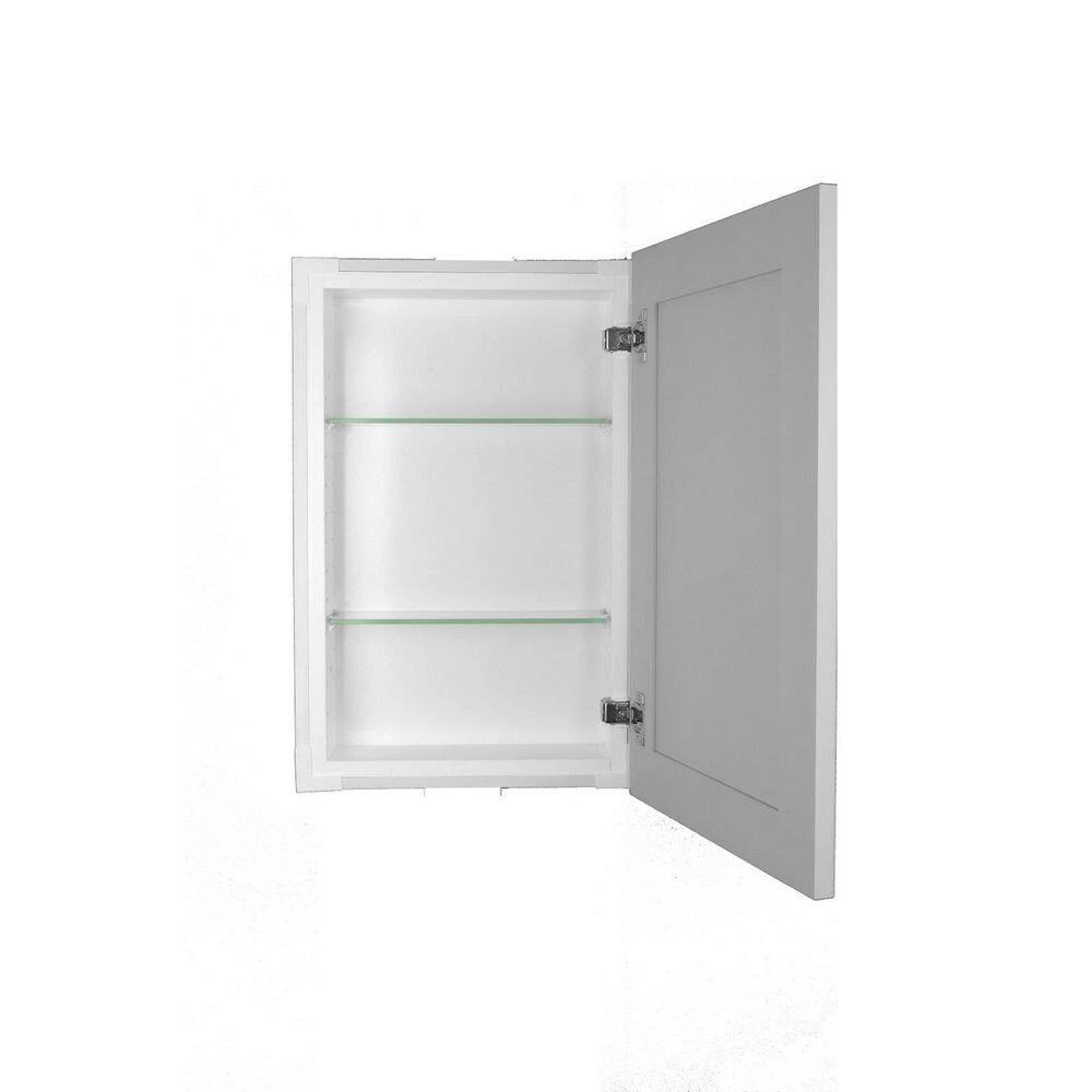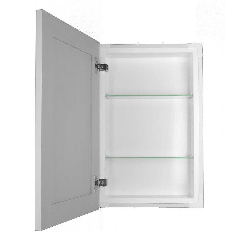Perfect for any bathroom. Recesses in the wall between the studs and simply screws to the studs on each side of the opening. Only the door is outside the wall. Fully adjustable glass shelves inside. Our unique, patented design of shelf supports keeps each shelf in place. Concealed hinges with soft close built in assures the door will never slam shut, but softly close on its own instead. Box is SOLID pine and the Shaker style door is SOLID maple. We’ve painted the inside of the box white, so you don’t have to. Door is primed and ready for you to paint it. The box is 3.5 in. deep inside and gives you plenty of usable depth, but fits in standard 2×4 walls. Cabinet box is 12.5 in. wide inside. Door is reversible to open either Left or Right. Completely assembled. All you need to do is put one screw in each hinge to mount the door. Then insert it in the wall and screw it to the studs with included screws. If you are replacing a current cabinet, measure your wall opening. White plastic trim surround covers the rough edges of your opening up to 1/2 in. all around. Door covers the trim surround when closed so the only thing you see outside the wall is the door itself.