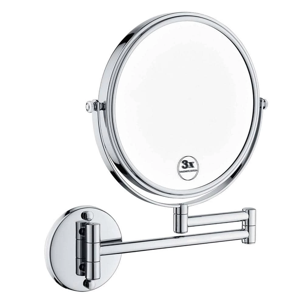 2-Sided magnificient: Wall Mount Installation and Electric Plug Powered. Touch to turn on/off, 1-side is regular mirror and the other is 3X magnification mirror. The regular side is perfect for daily uses, cosmetics, and every beauty need. The 3X magnification side uses for wearing contact lenses, eyebrow trimming, makeup, and shaving. Please use 3x magnification within 4 in. to get true image.