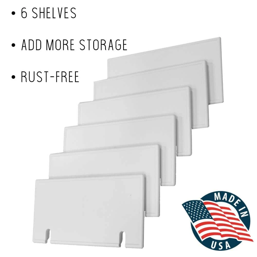 - Shelves are white 6.375 in. x 3.375 in. rectangular slides