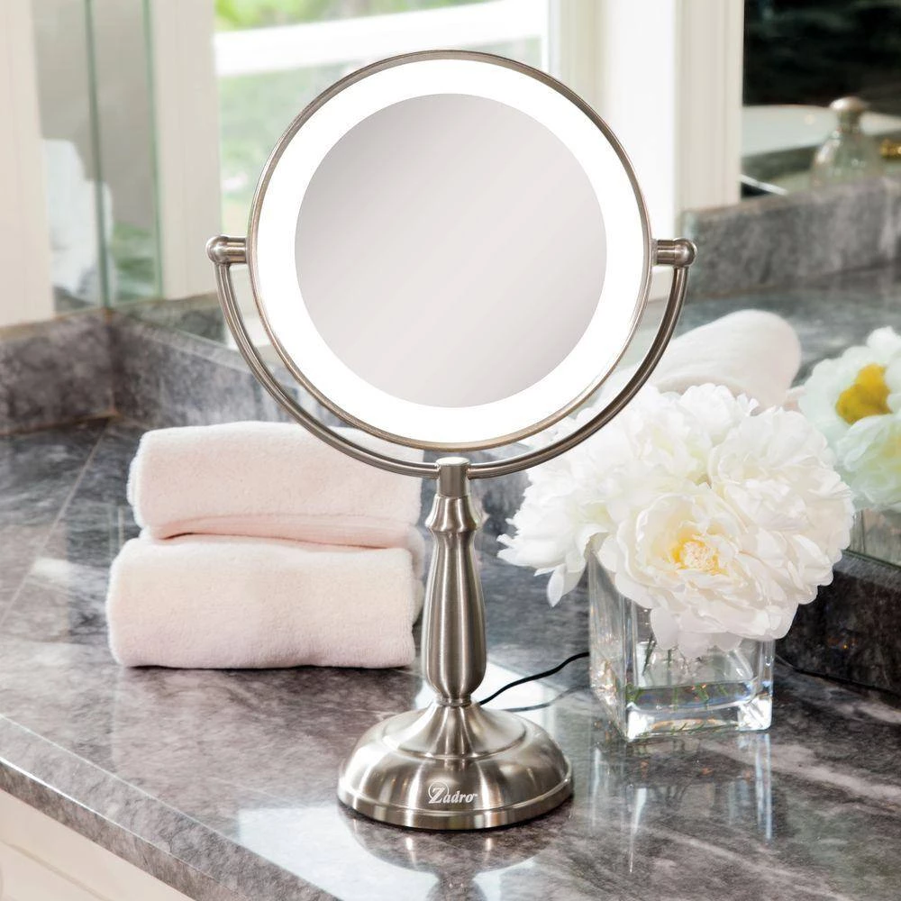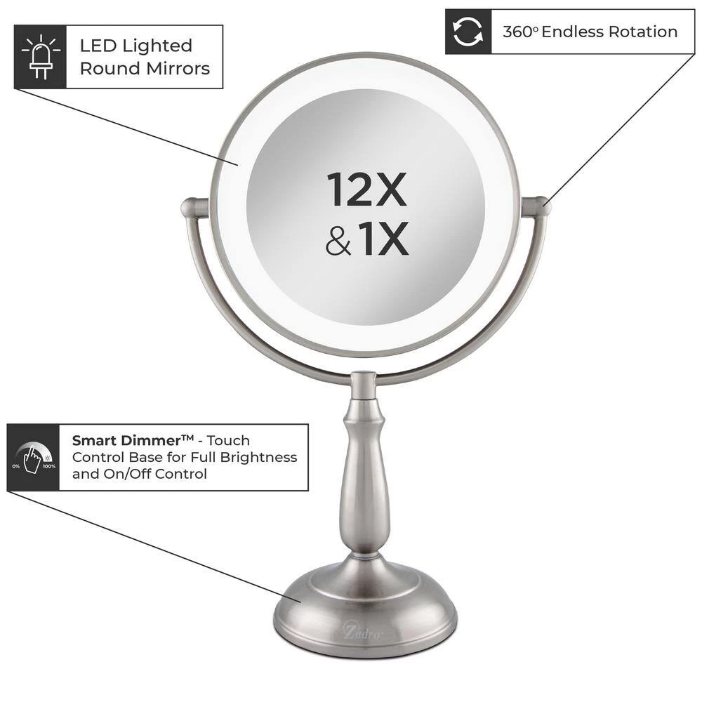 Upgrade your morning routine and get ready faster with Zadro’s Dimmable Touch Dual-Sided LED Lighted Vanity Mirror. Energy-efficient LEDs illuminate your entire face and always stay cool to the touch. Dimmable touch technology on the base easily allows you to soften or brighten the lighting level and remembers the last lighting setting used. The powerful 12X magnification side is great for details and touch-ups, while the convenient 1X side provides an immaculate view of your entire face for everyday needs. Swivel the mirror effortlessly between each magnification side to apply makeup with ease. Unlike mirrors that use acrylic for its reflective surface, this mirror features optical quality glass that gives the sharpest and clearest reflection so that you can clearly see all the details for your makeup and beauty routine.