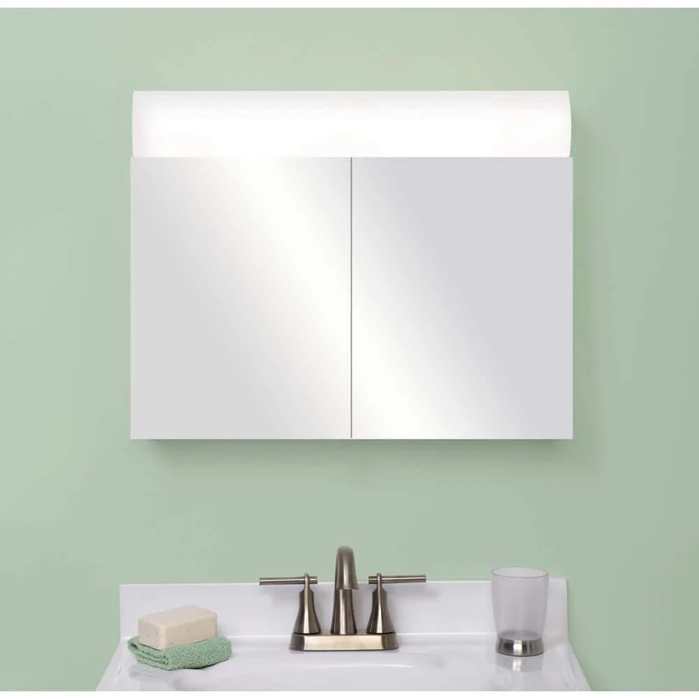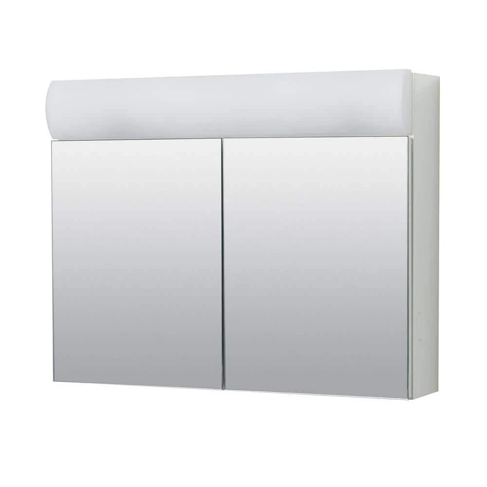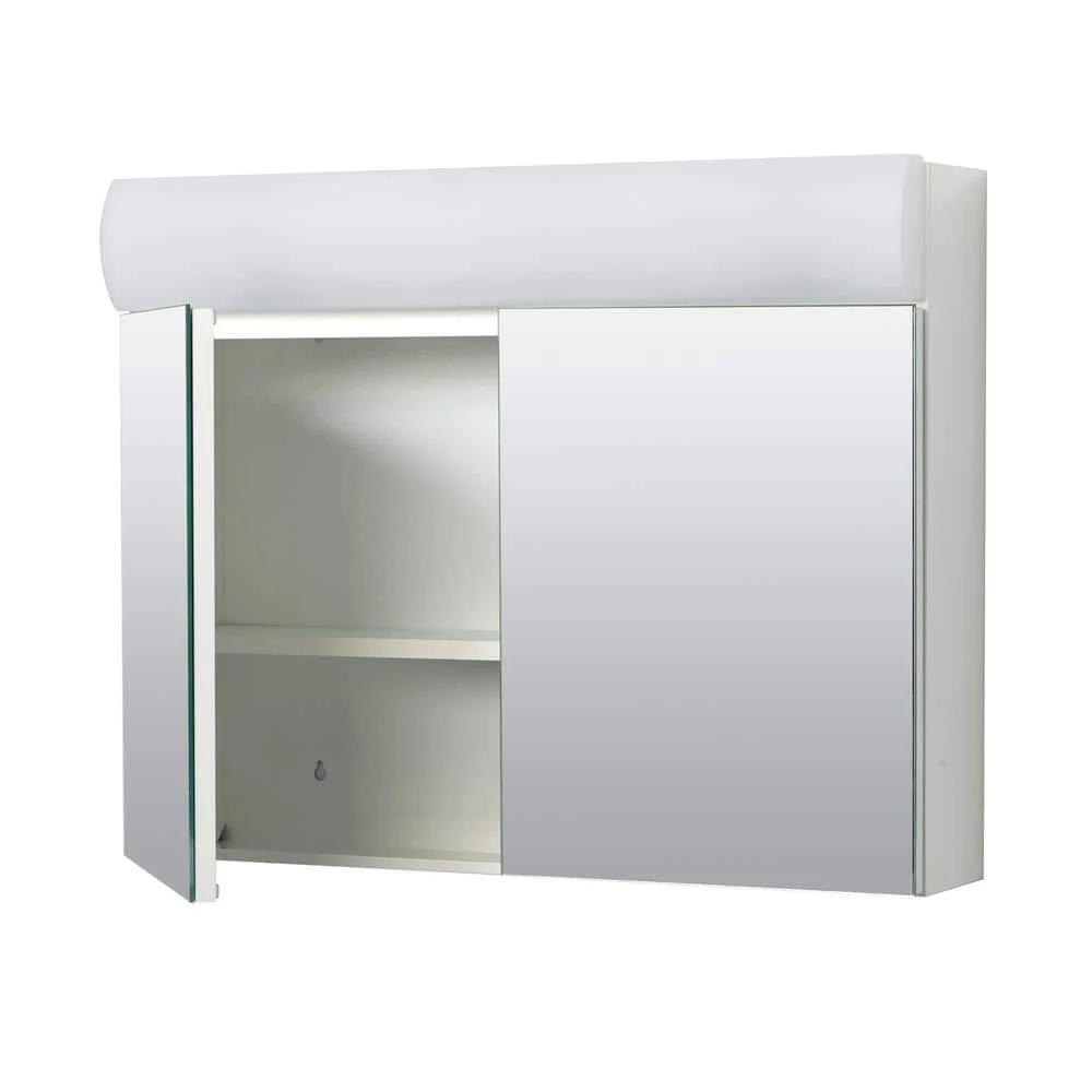 With its frameless mirror surface and built-in lighting, the Zenith Lighted Frameless Bi-View Medicine Cabinet will help you to look your best every day. At the same time, thanks to its sleek shape and white powder-coated steel body, this lighted medicine cabinet also will help improve the look of your bathroom. Behind the cabinet’s two mirrored doors, there is an adjustable shelf with plenty of room for storing bath items out of sight. The cabinet uses two standard bulbs for illumination, and includes an interior light switch as well as a 3-prong outlet.